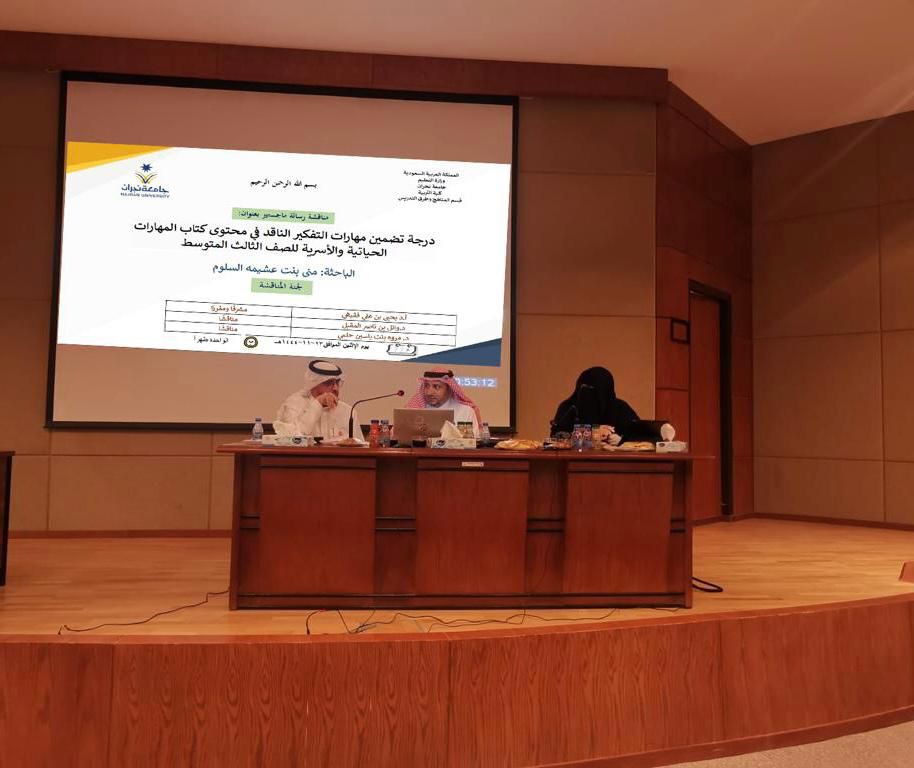 عقدت كلية التربية يوم الأحد الموافق 23/ 11/ 1444هـ في مسرح الكلية مناقشة رسالة الماجستير الموسومة بـ "درجة تضمين مهارات التفكير الناقد في محتوى كتاب المهارات الحياتية والأسرية" المقدمة من الطالبة: منى عشيمة حسين السلوم، بقسم المناهج وطرق التدريس ، وقد تكونت لجنة المناقشة من أ.د. يحيى علي فقيهي مشرفاً ومقررا، ود. وائل ناصر آل مقبل مناقشاً أول، ود. مروة ياسين حلمي مناقشاً ثانِ، وقد استمرت المناقشة من الساعة الواحدة ظهراً حتى الساعة الثانية والثلث ظهراً، وقد أوصت اللجنة بقبول الرسالة مع استكمال التعديلات المطلوبة.
