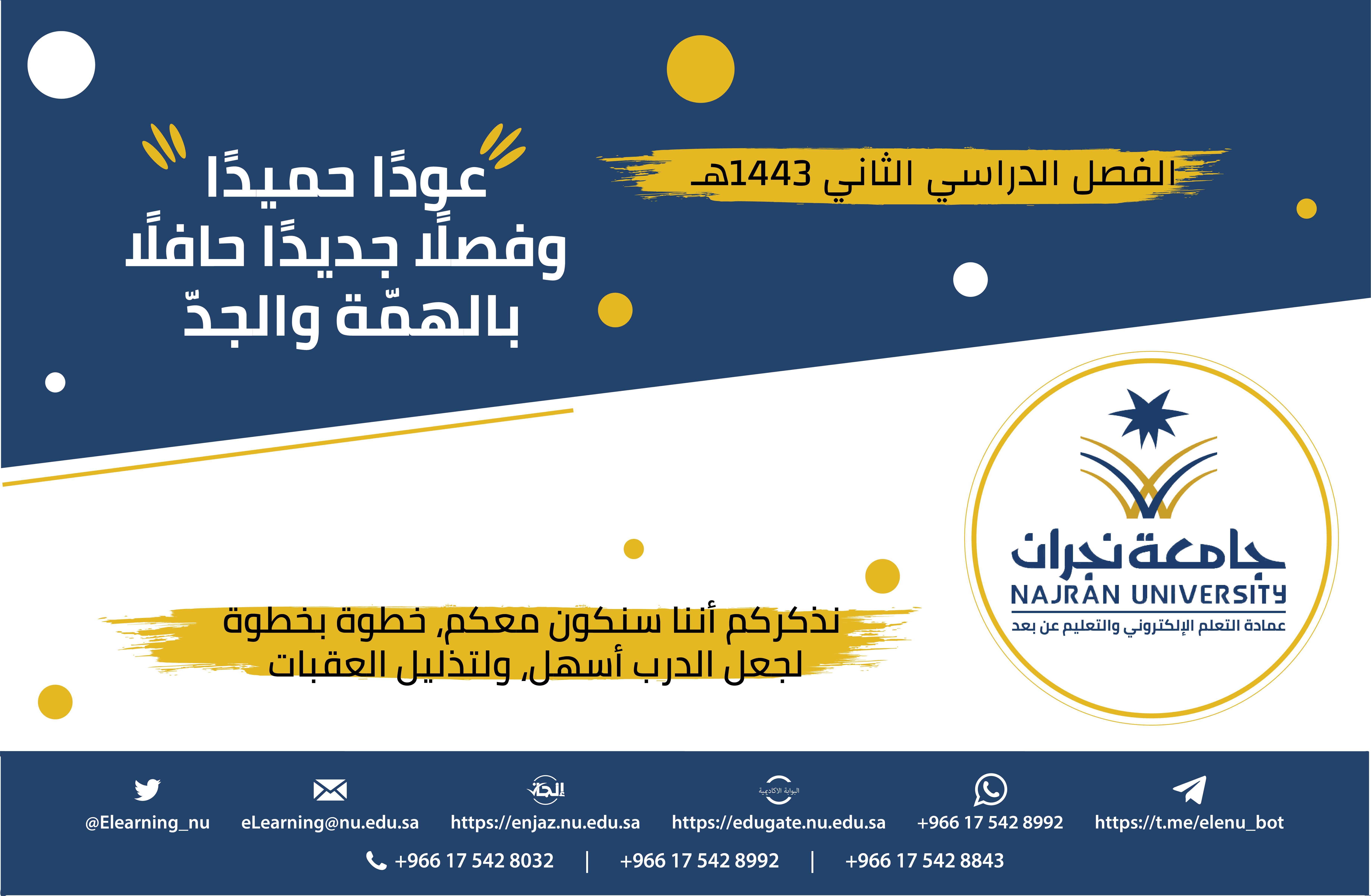 null العمادة تهنئ أبناءها الطلبة بالفصل الدراسي الثاني 1443هـ