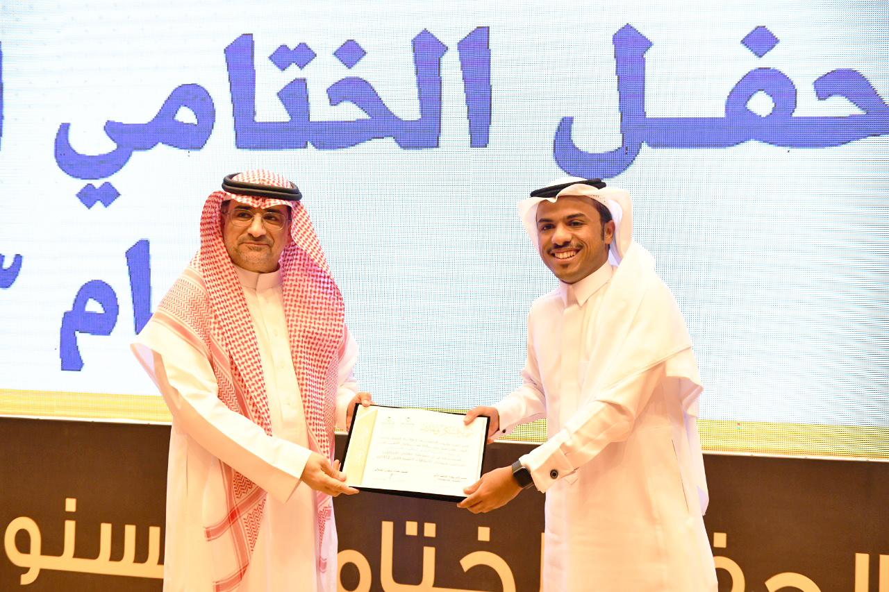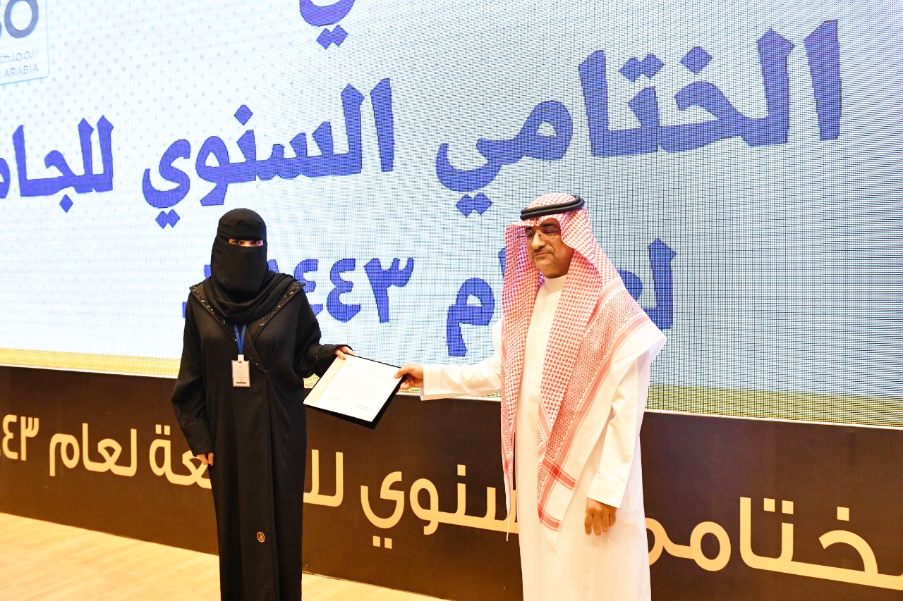 Within the framework of the annual closing ceremony at Najran University for the year 1443 AH, which was held on Wednesday 10/17/1443 AH in the theater of the administrative building for female students, the high level of the employees of the Deanship of E-Learning was clearly demonstrated by honoring the President of Najran University, Prof. Dr. Abdul Rahman Al-Khudairi for two of them for obtaining first and second places in the First Technical Innovations Forum Competition 2022 AD, where A. Dhafer Bahrar won the first place award for the (Exams Platform) project, and Thikra Al- Harithi won the second place award for the project (automated response service for managing academic and student services).