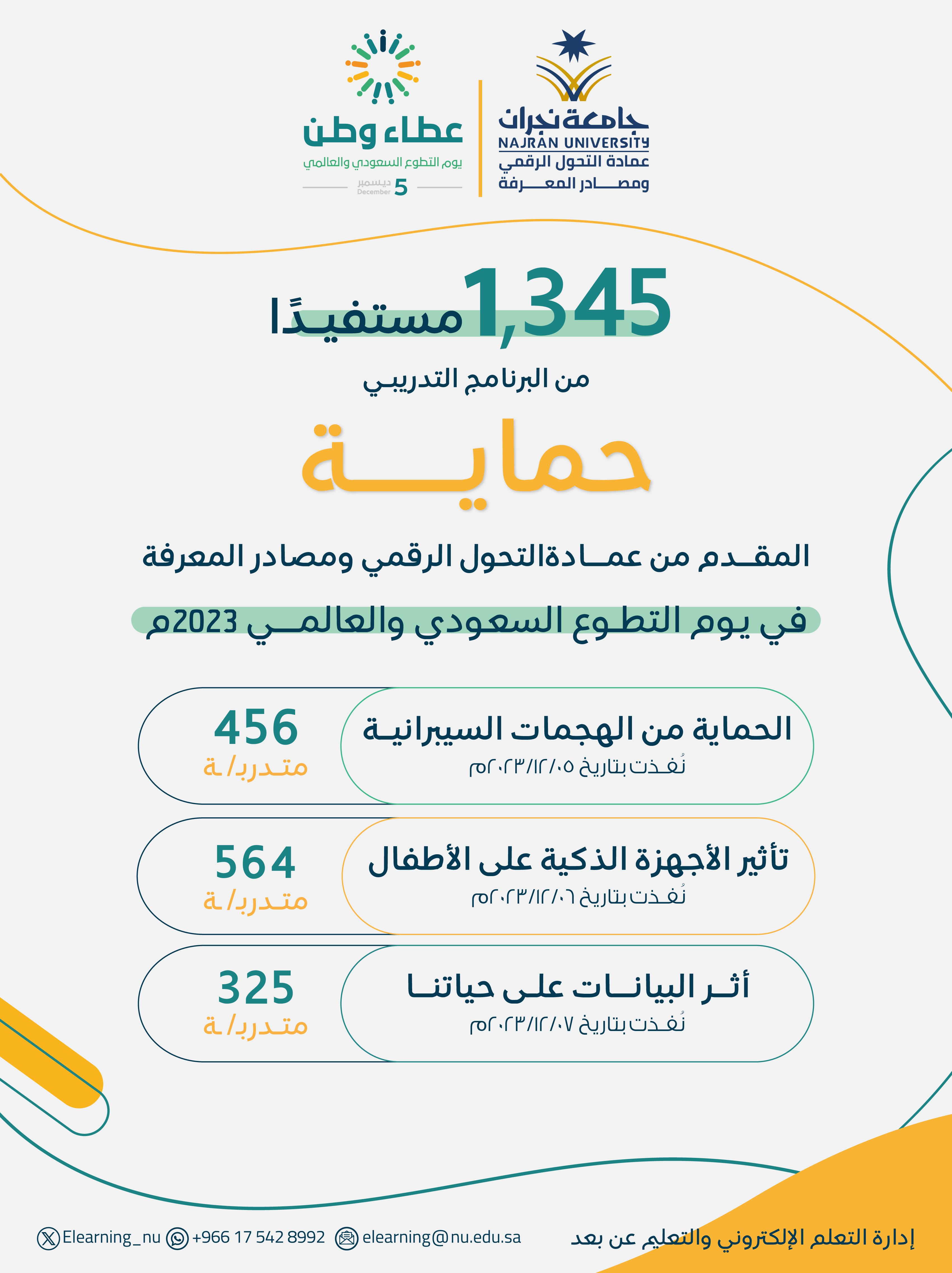 On Thursday, 12/07/2023 AD, the Deanship of Digital Transformation and Knowledge Resources, represented by the Administration of E-Learning and Distance Education, concluded the “Protection” training program, which it launched in conjunction with the Saudi and International Volunteer Day 2023 AD, and more than 1,300 trainees benefited from it. The program included three Training courses aiming to provide trainees with a comprehensive understanding of the importance of data shared in cyberspace, the most prominent risks and harms targeting users of smart devices, and how to prevent and deal with them, in addition to the importance of protecting children from addiction to using smart devices, and their most prominent health and behavioral effects. Educational and  technical solutions that may help reduce these damages. At the conclusion of the program, the impact of data on our lives, explaining its nature, and the negative and positive effects of sharing data over the Internet and through various programs.