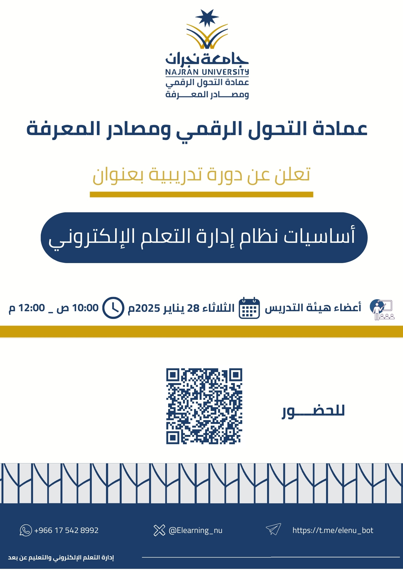 The Deanship of Digital Transformation and Knowledge Resources, represented by the Administration of E-Learning and Distance Education, organized a training course entitled "Blackboard Basics" on Tuesday, January 28, 2025, for faculty members to enhance their skills in using the system efficiently. The course was attended by 81 members from various colleges, and included a detailed explanation of course management, organizing educational content, and interacting with students through the system's tools, in addition to monitoring their performance using analytical reports. The course witnessed remarkable interaction from the participants, as time was allocated to answer inquiries and present practical scenarios that contribute to the actual application of the concepts presented. This course is part of a series of training programs that aim to enable faculty members to employ modern technologies in education, and to create an interactive educational environment that keeps pace with digital transformations. The Deanship is also keen to provide such training programs periodically, and to add advanced workshops on creating electronic tests and analyzing student data.