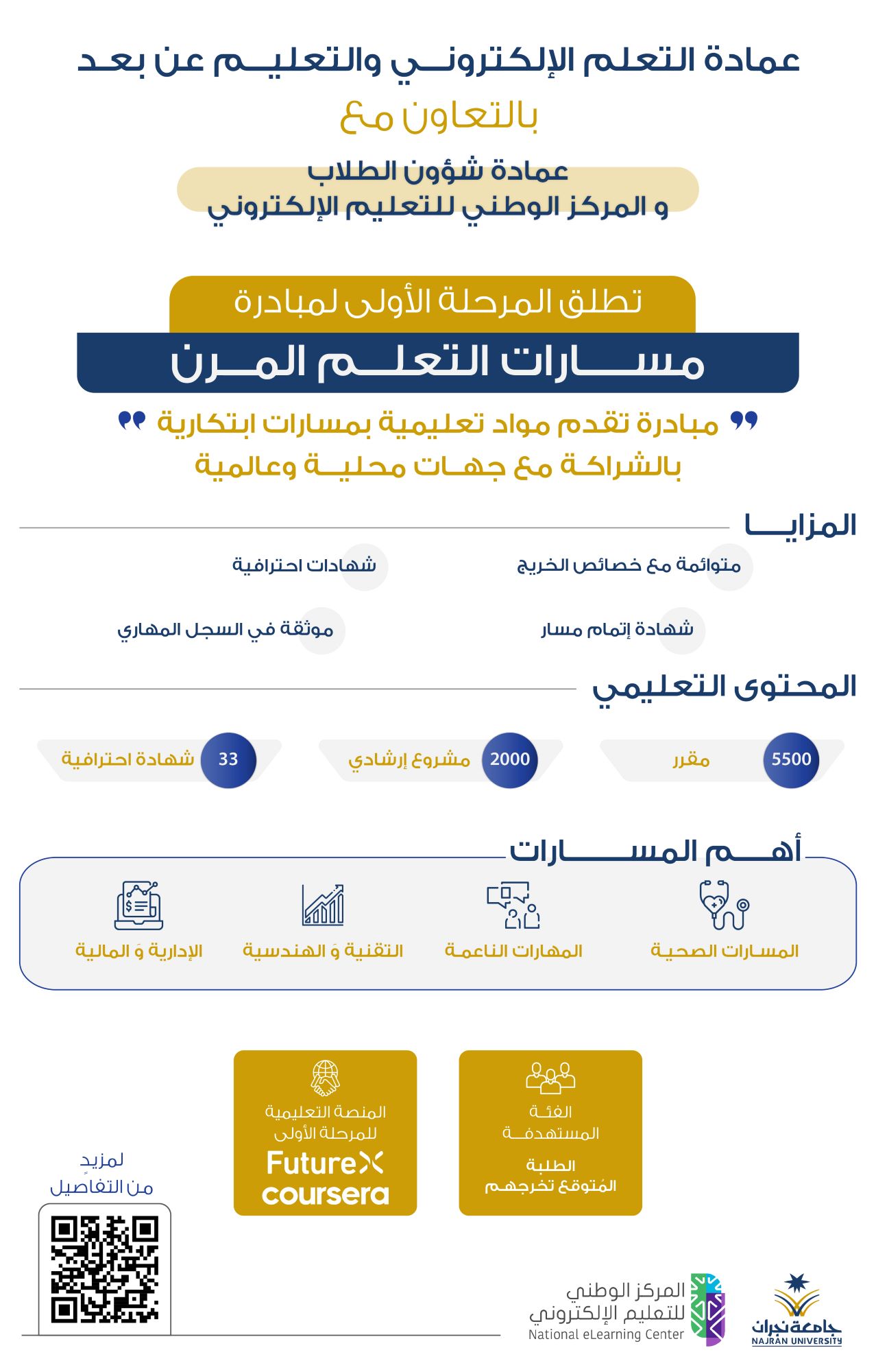 Najran University represented by the Deanship of E-Learning and Distance Education and the Deanship of Student Affairs - launched the first phase of flexible learning paths in cooperation with the National Center for E-Learning, which is a national initiative that offers innovative paths, in partnership with local and international entities.