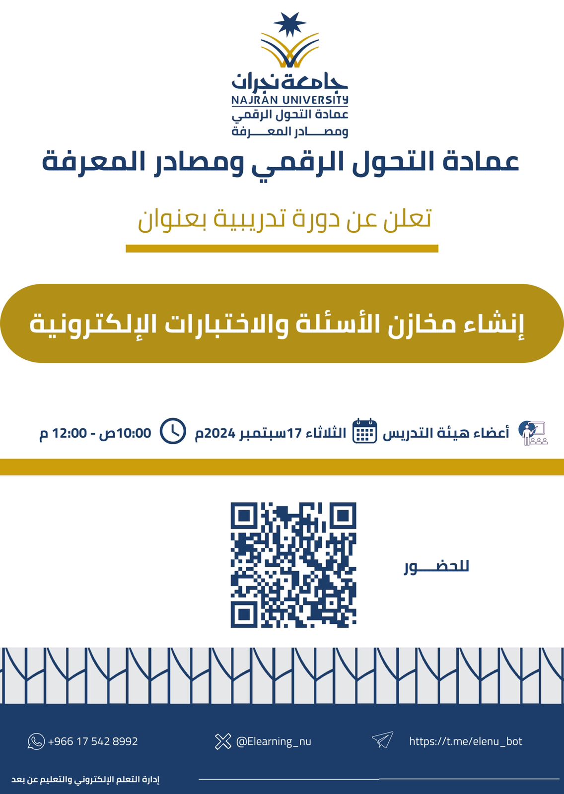 عقدت عمادة التحول الرقمي ومصادر المعرفة، ممثلة في إدارة التعلم الإلكتروني والتعليم عن بعد، دورة تدريبية لعضاء هيئة التدريس بعنوان "إنشاء مخازن الأسئلة والاختبارات الإلكترونية" يوم الثلاثاء الموافق 17 سبتمبر 2024م.