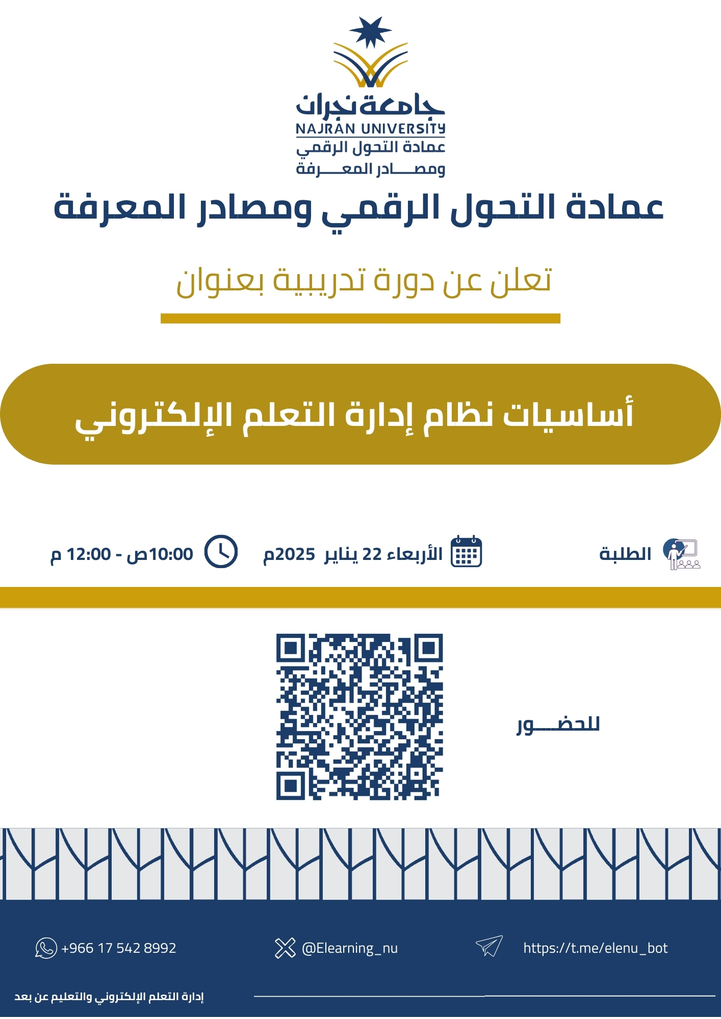 This course comes within the framework of the university's ongoing efforts to support e-learning and enhance students' skills in using modern technologies to facilitate the distance learning process, in line with the Kingdom's Vision 2030 in promoting digital transformation in education.