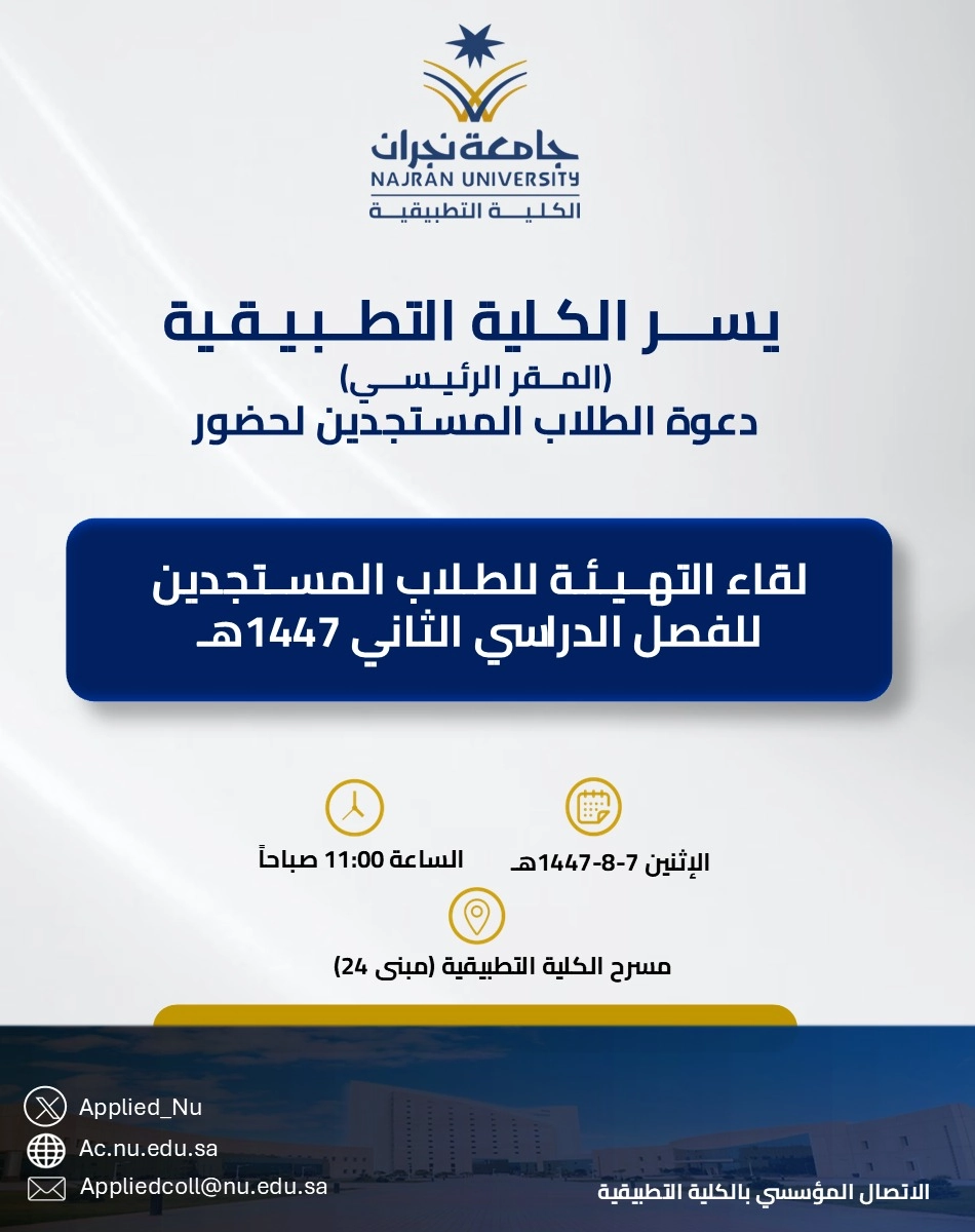 null الكلية التطبيقية – المقر الرئيسي – تدعو الطلاب المستجدين لحضور لقاء التهيئة – الفصل الدراسي الثاني 1447