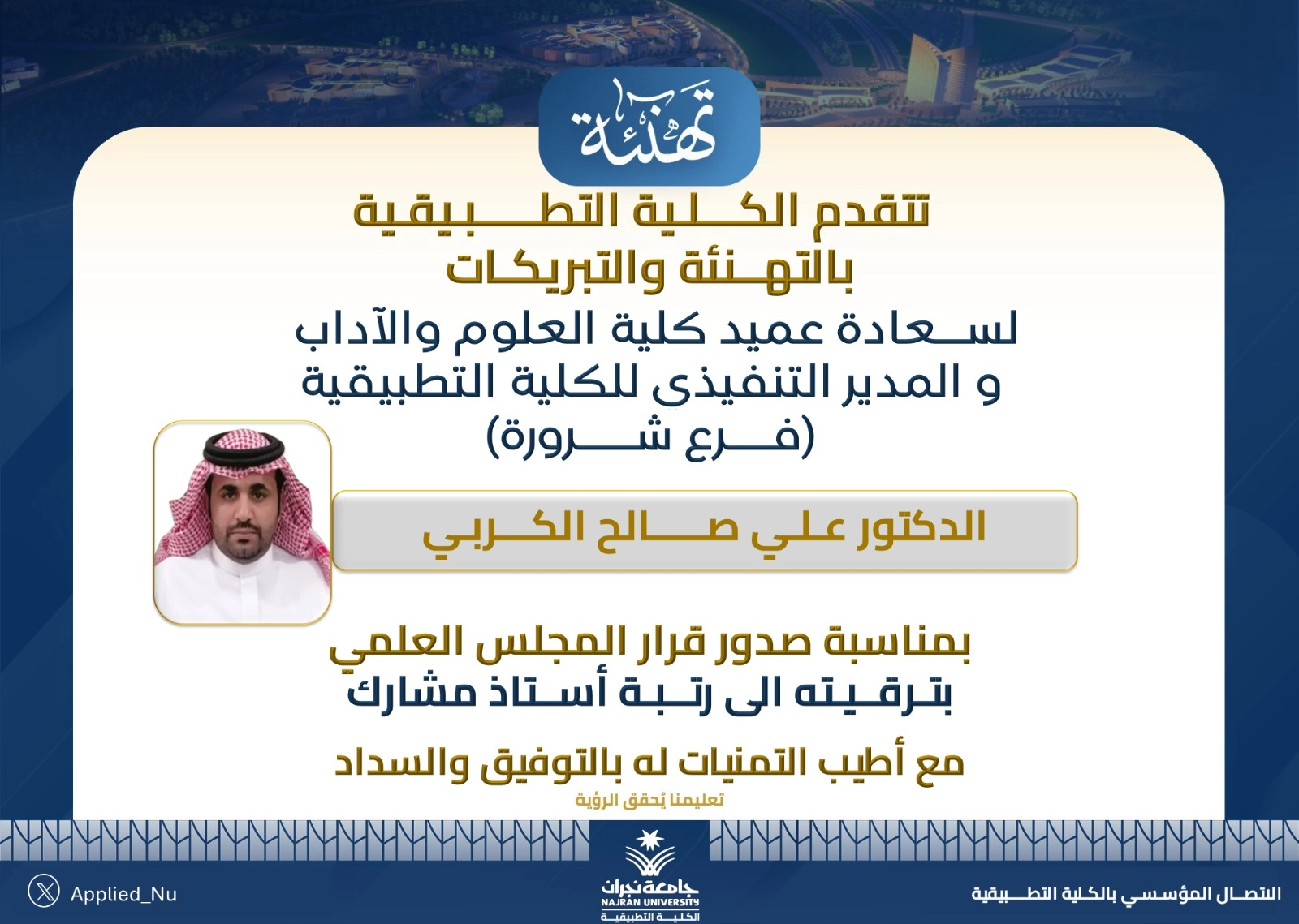 null تهنئة للمدير التنفيذي للكلية التطبيقية – فرع شرورة – الدكتور علي بن صالح بن سالم الكربي بمناسبة ترقيته الى درجة أستاذ مشارك
