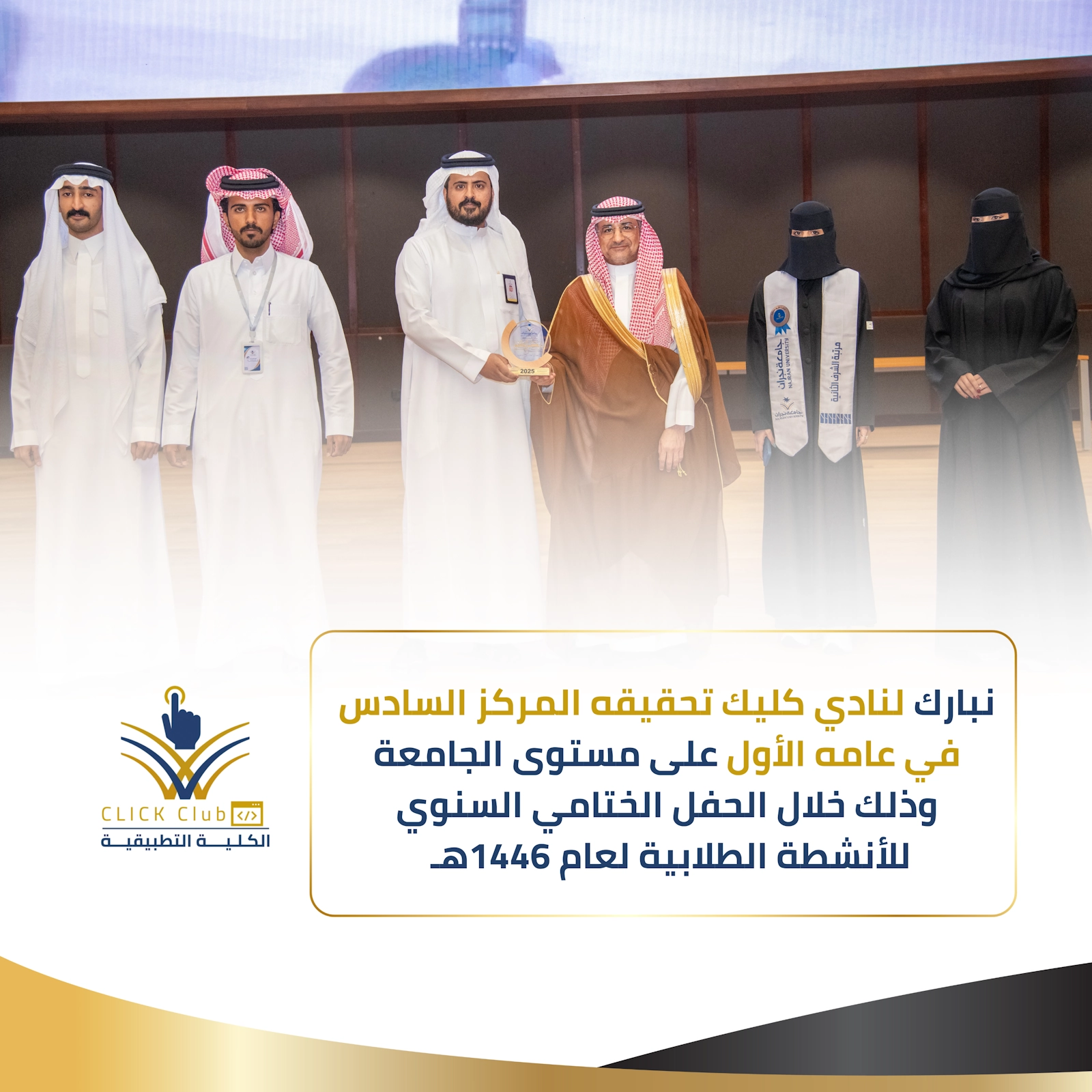 null تهنئة بمناسبة تحقيق نادي كليك في الكلية التطبيقية المركز السادس في عامه الأول على مستوى الجامعة في حفل جامعة نجران الختامي للأنشطة الطلابية 1446
