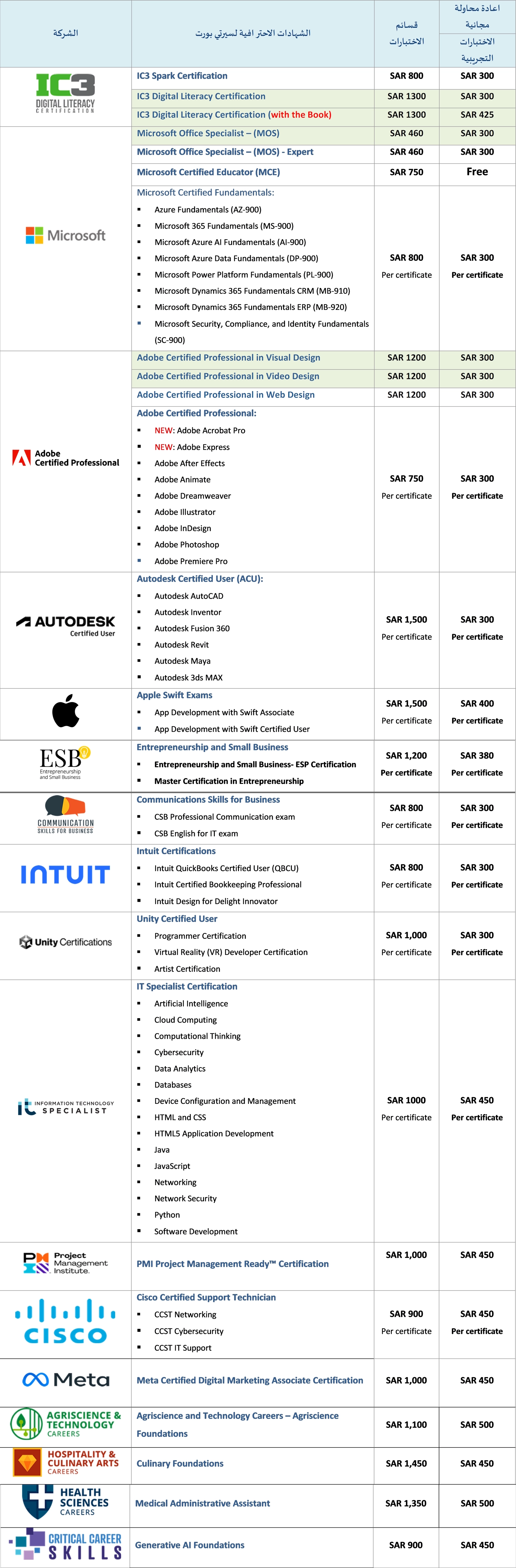 قائمة بشهادات شركة الإختبارات العالمية Certiport وشركائها