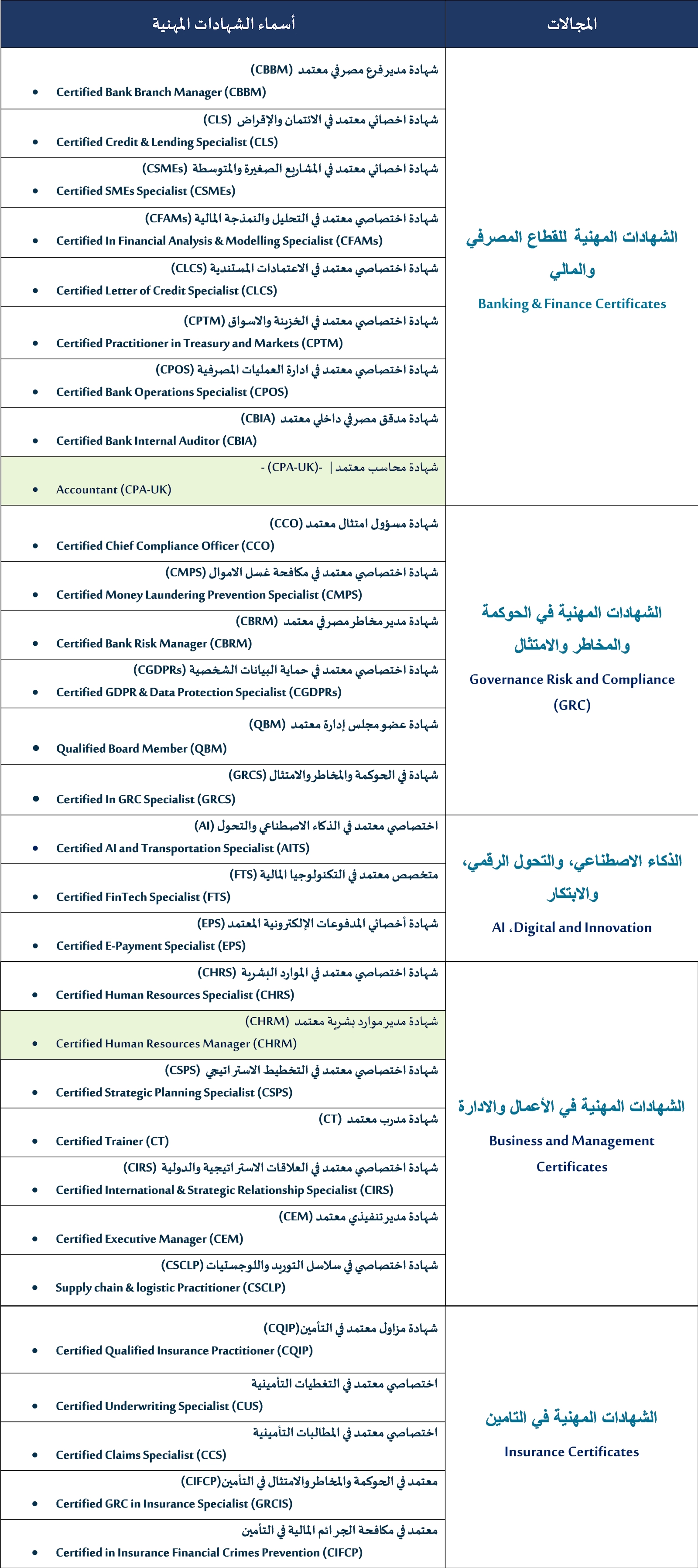 | 27 | محترف أعمال معتمد في إدارة النزاعات CBP | نعم | 1840 | 920 | 920 |