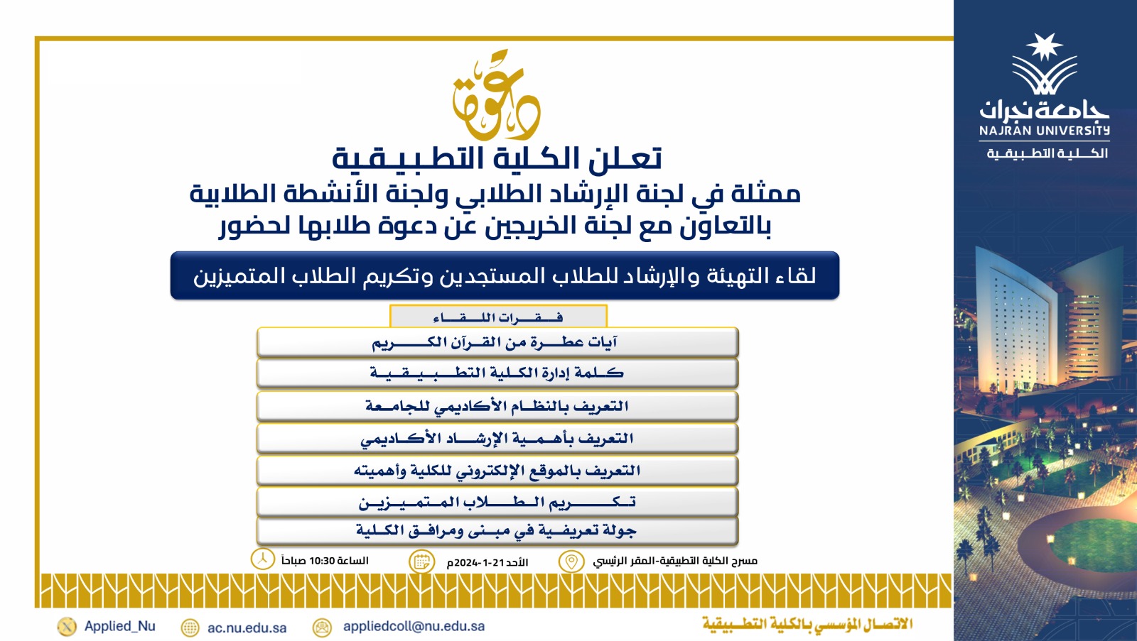 null الكلية التطبيقية – المقر الرئيسي – تدعو الطلبة لحضور لقاء التهيئة للطلبة المستجدين وتكريم الطلاب المتميزين – الفصل الثاني 1445