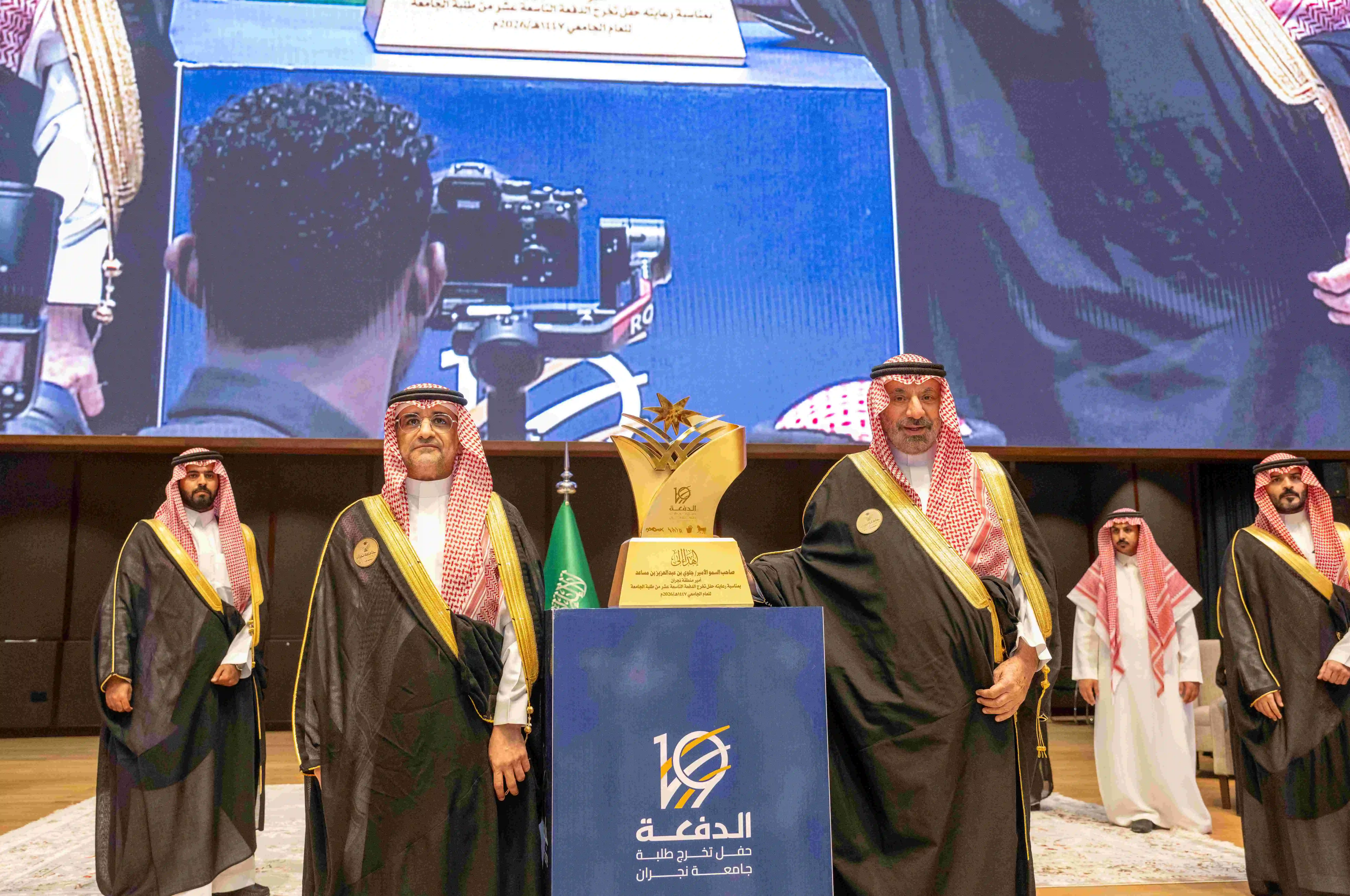 His Royal Highness Prince Jloui bin Abdulaziz bin Musaed, Governor of Najran Region, patronized the graduation ceremony of the nineteenth cohort of Najran University's male and female students for the academic year 1447 AH, comprising 5,872 graduates, held at the University's Conferences and Events Center.