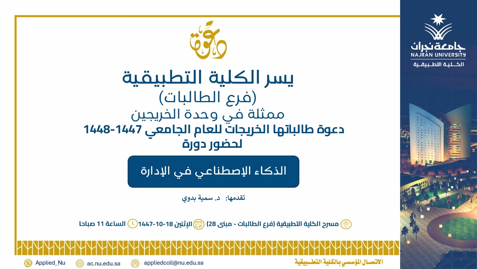 Alumni Unit at Applied College (Female Branch) invites its alumnae of the 1447-1448 academic year to attend a course titled "Artificial Intelligence in Management" – Second Semester 1447