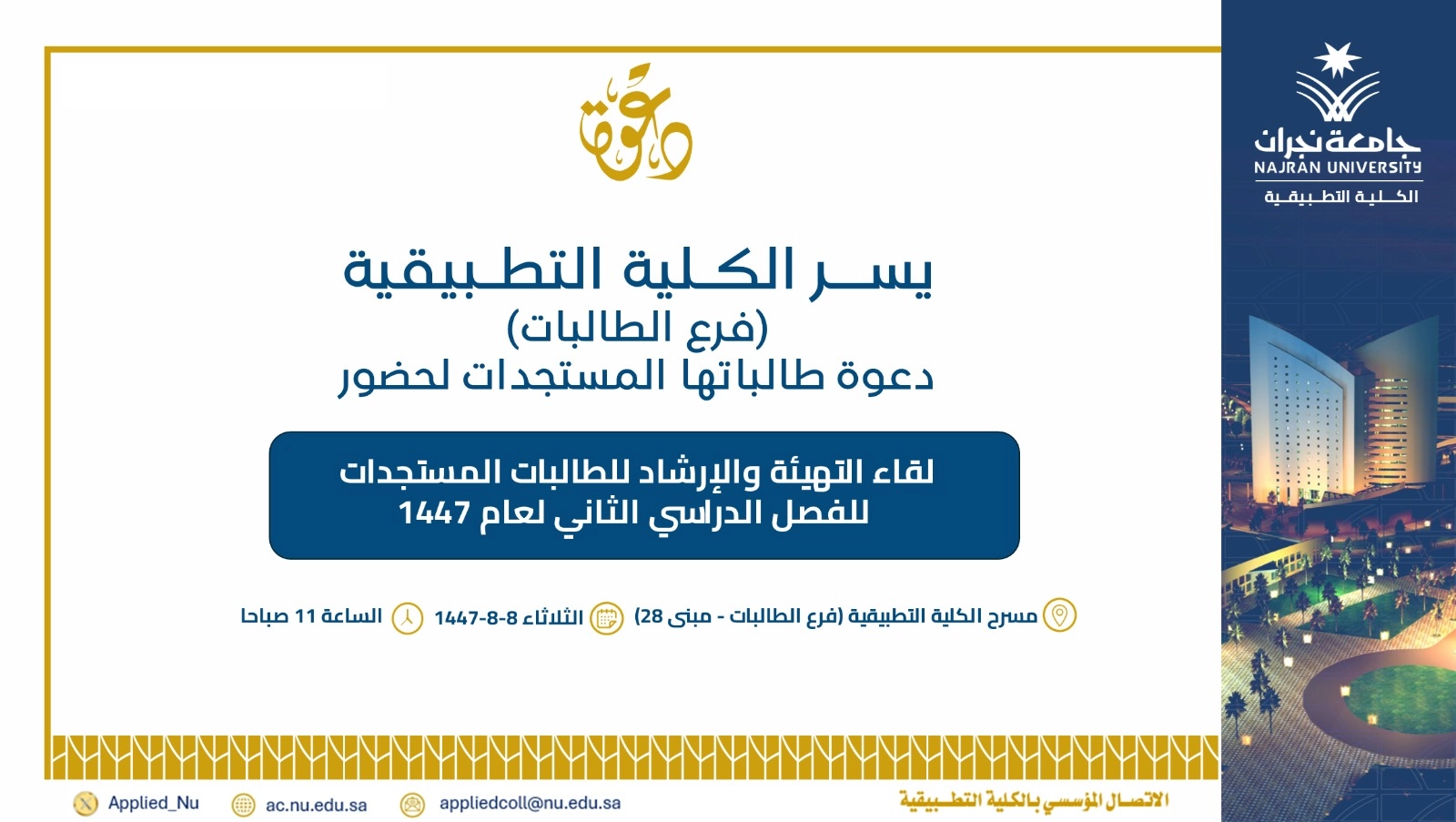 null Applied College – Female Branch – invites new female students to attend the Orientation and Advising Meeting – Second Semester 1447