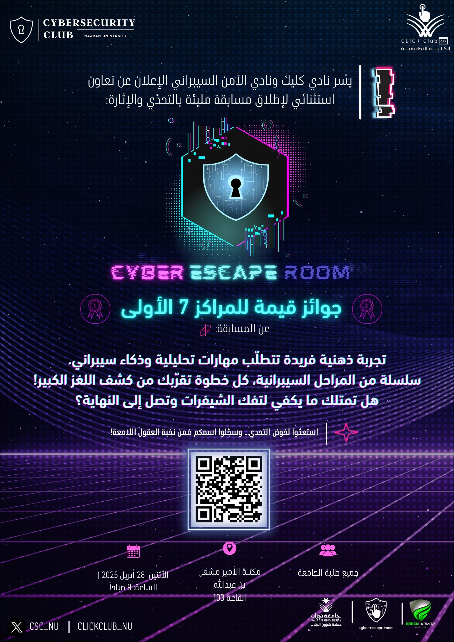 Click Club at the Applied College, in collaboration with the Cybersecurity Club at the College of Computer Science and Information Systems, invites University students to participate in the "Cyber Escape Room" competition – Second Semester 1446