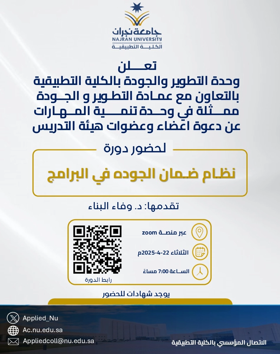 The Development and Quality Unit at the Applied College, in collaboration with the University's Deanship of Development and Quality, invites male and female faculty members to attend a training course titled "Quality Assurance System in Academic Programs" – Second Semester, 1446