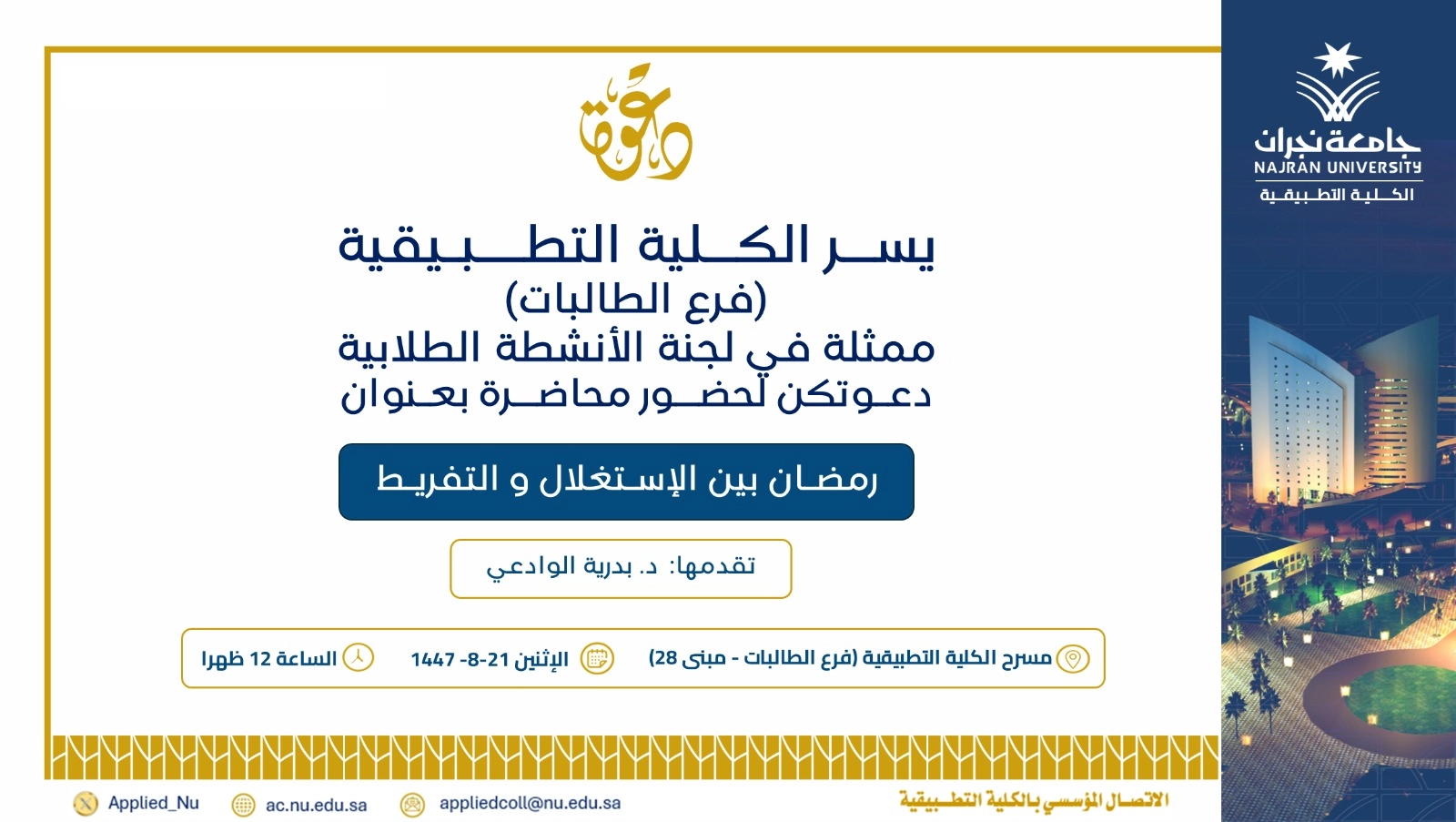The Student Activities Committee at the Applied College – Female Branch – invites female students to attend a lecture titled "Ramadan: Between Seizing the Opportunity and Neglect" – Second Semester 1447