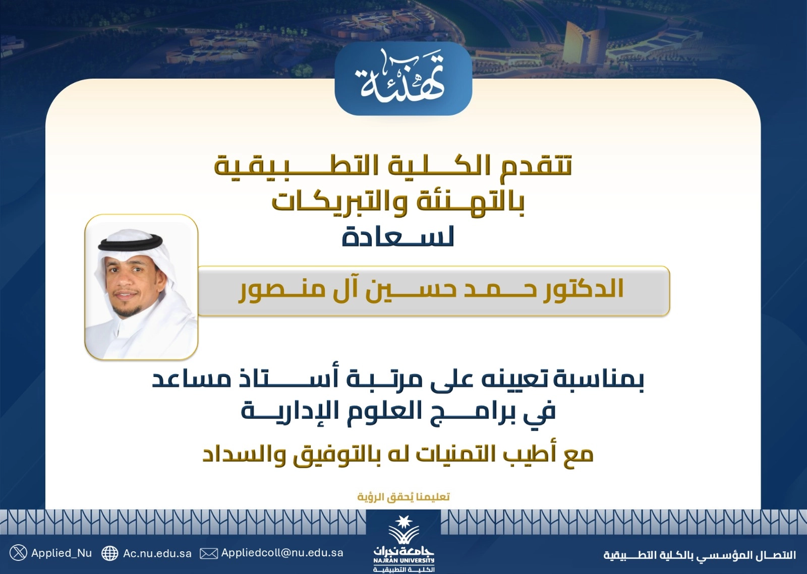 null Congratulations to Dr. Hamad Hussein Al Mansour on his appointment as Assistant Professor in Administrative Sciences Programs
