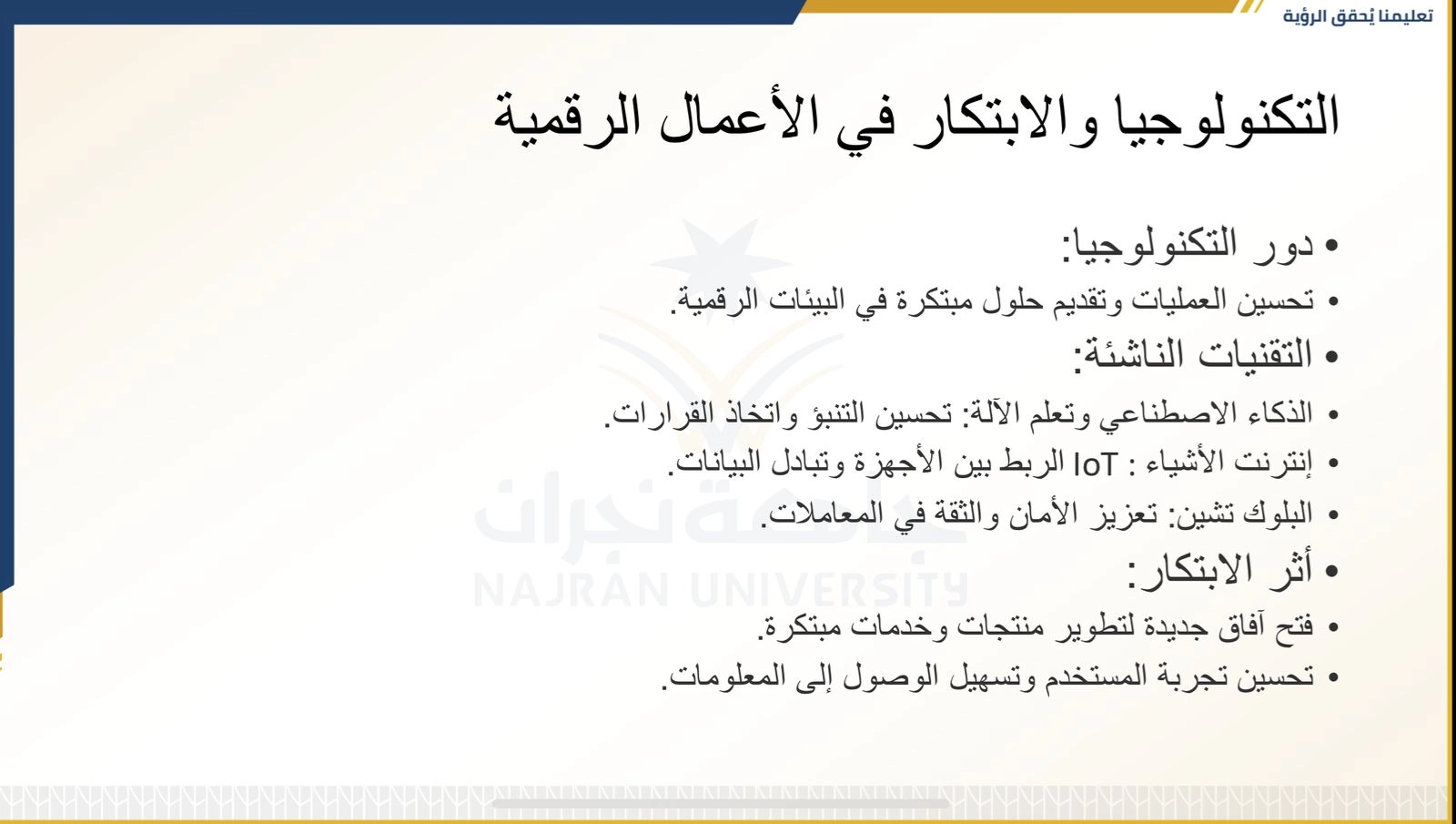 The lecture aimed to enhance awareness of the importance of adapting to technological developments and how to leverage them to achieve success in the field of entrepreneurship, while also discussing the challenges that digital entrepreneurs may encounter.