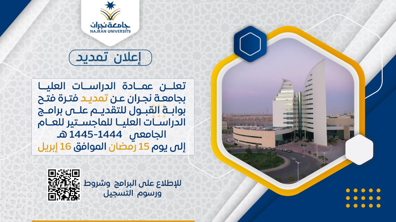 null تعلن عمادة الدراسات العليا عن تمديد فترة فتح بوابة القبول للتقديم حتى 15 رمضان