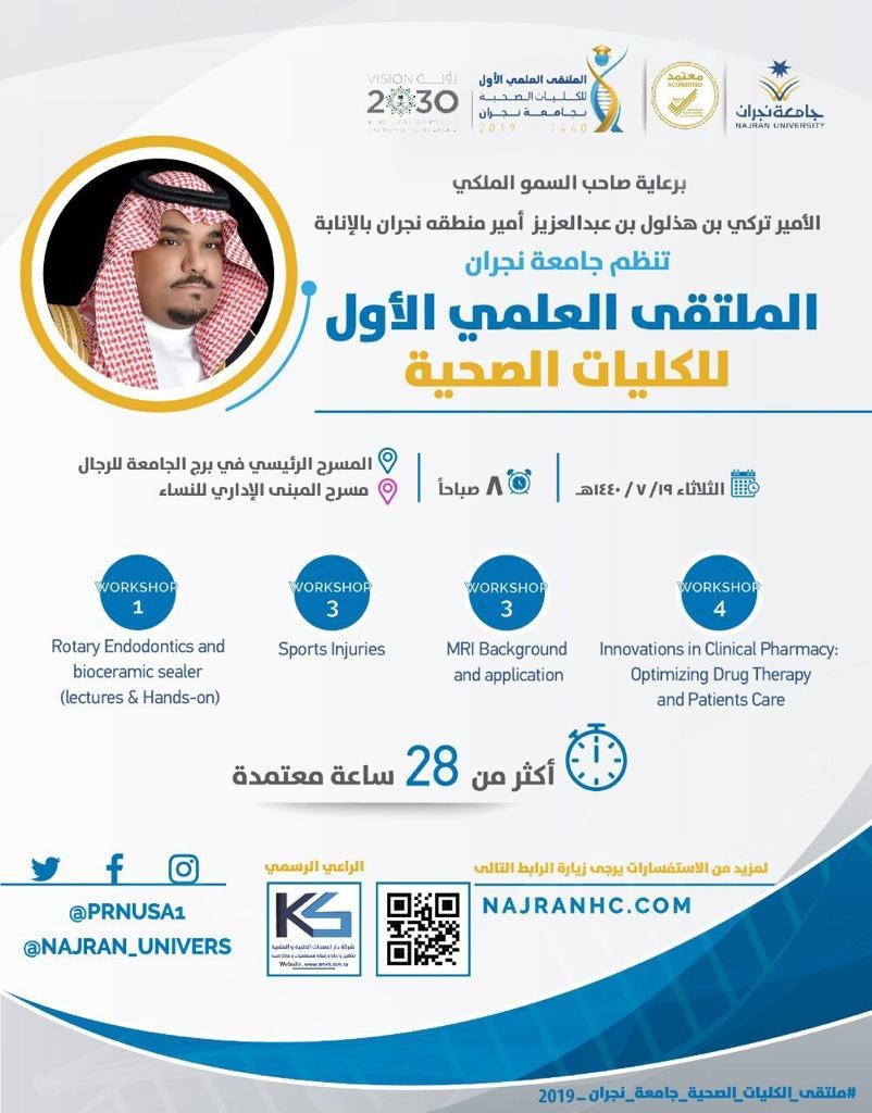 برعاية صاحب السمو الملكي الأمير تركي بن هذلول بن عبدالعزيز أمير منطقة نجران بالإنابة تنظم جامعة نجران الملتقى العلمي الأول للكليات الصحية يوم الثلاثاء 19 رجب 1440هـ الساعة الثامنة صباحا