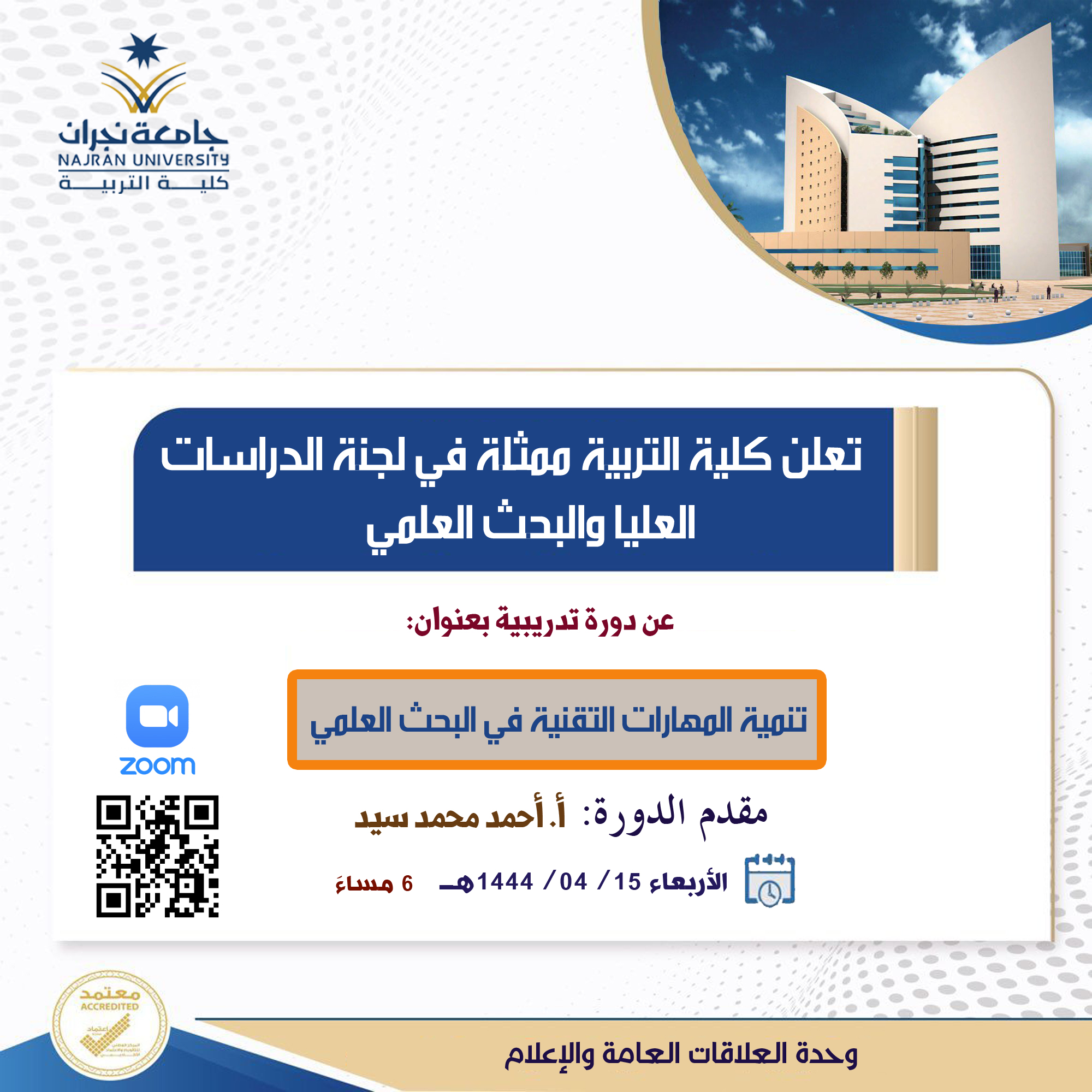 null تعلن كلية التربية ممثلة في لجنة الدراسات العليا والبحث العلمي عن إقامة دورة تدريبية