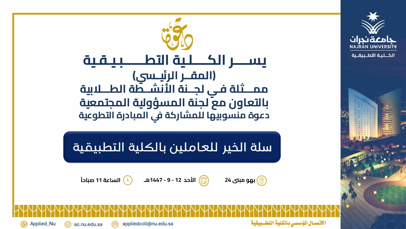 null لجنة الأنشطة الطلابية بالتعاون مع لجنة المسؤولية المجتمعية في الكلية التطبيقية - المقر الرئيسي - تدعو منسوبيها للمشاركة في المبادرة التطوعية " سلة الخير للعاملين بالكلية التطبيقية " – الفصل الثاني 1447