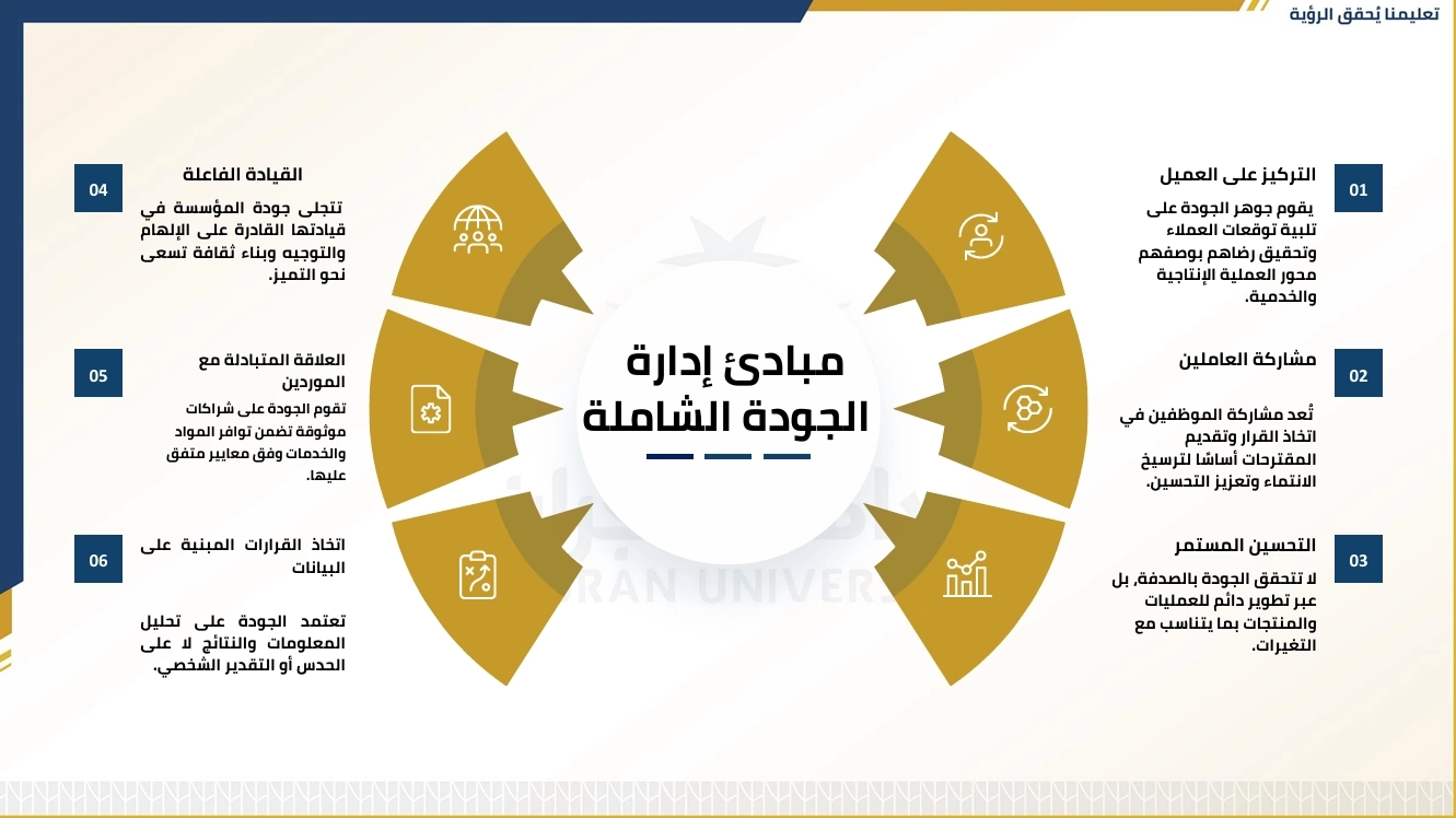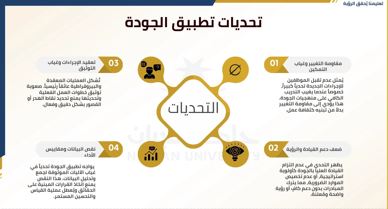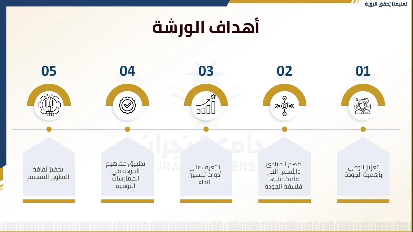 قدم الورشة د. حمد آل منصور رئيس وحدة التطوير والجودة في الكلية وهدفت الورشة إلى استعراض رحلة الجودة المؤسسية من مرحلة الامتثال للمعايير والأنظمة إلى مرحلة تحقيق الأداء المتميز المستدام. ويتم ذلك عبر تناول نماذج عملية ودراسات حالة لمؤسسات حققت نجاحا فعليا في تطبيق استراتيجيات الجودة. وسعت الورشة إلى توضيح كيف تسهم إدارة الجودة الشاملة في بناء بيئة عمل فعالة قائمة على القيم، والتعاون، والابتكار التنظيمي.