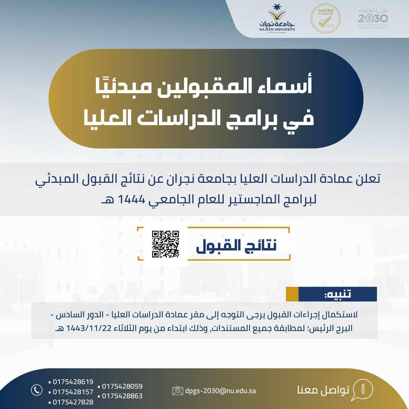 أعلنت الجامعة -ممثلة في عمادة الدراسات العليا- نتائج القبول المبدئي في برامج الماجستير الأكاديمي والمهني والتنفيذي للعام الجامعي 1444هـ من خلال الدخول على الرابط التالي: اضغط هنا