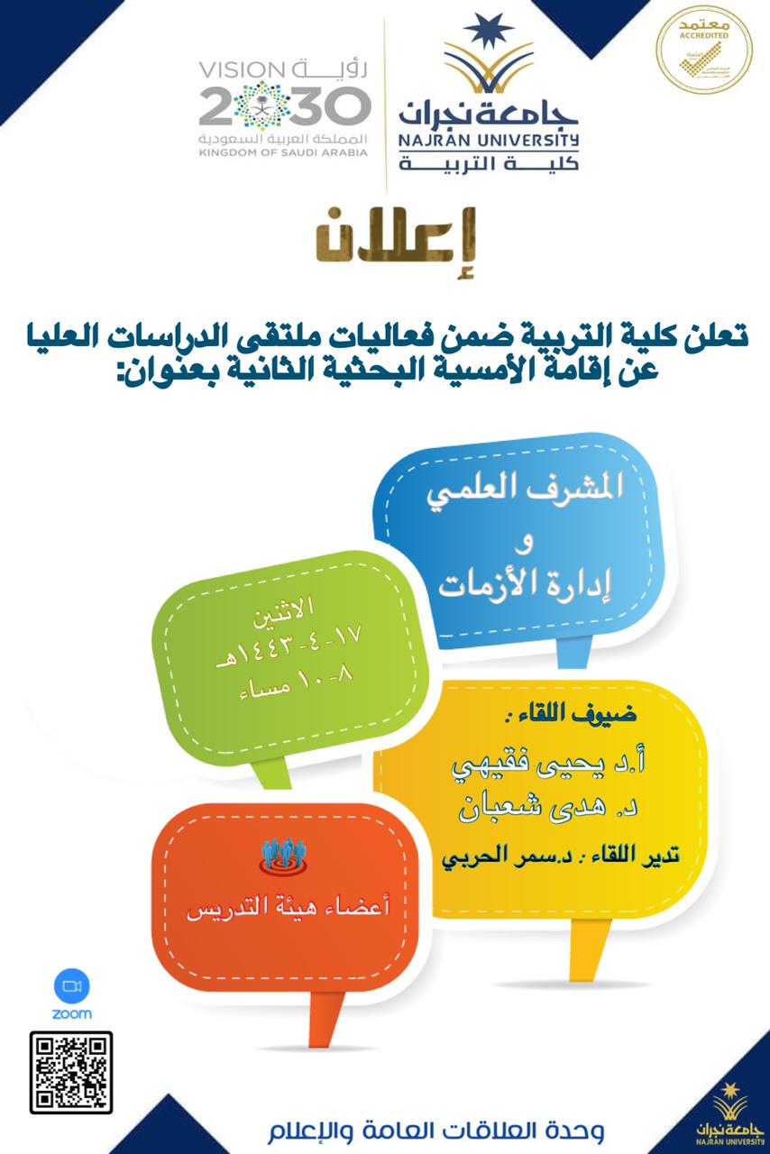 أقامت كلية التربية ممثلة في لجنة الدراسات العليا يوم الاثنين الموافق 17/4/1443هـ أمسية بحثية بعنوان (المشرف العلمي وإدارة الأزمات)، وقد استهدفت أعضاء هيئة التدريس وذلك عبر منصةzoom ، وقد تناول اللقاء الذي قدمه أ.د يحيى فقيهي الأستاذ بقسم المناهج وطرق التدريس ود.هدى شعبان الأستاذ المشارك بقسم التربية الخاصة وأدارته د.سمر الحربي الأستاذ المساعد في قسم المناهج وطرق التدريس ورئيسة قسم رياض الأطفال عدة محاور منها: كيفية تجاوز المشكلات التي واجهت الطلاب والطالبات أثناء أزمة كورونا ،الأساليب البديلة في الإشراف العلمي التي يمكن استخدامها أثناء مواجهة الأزمات ،عرض خبرات إشرافية مميزة ومفيدة ،أهم الممارسات التي يمارسها المشرف مع الطالب لاختيار العنوان.