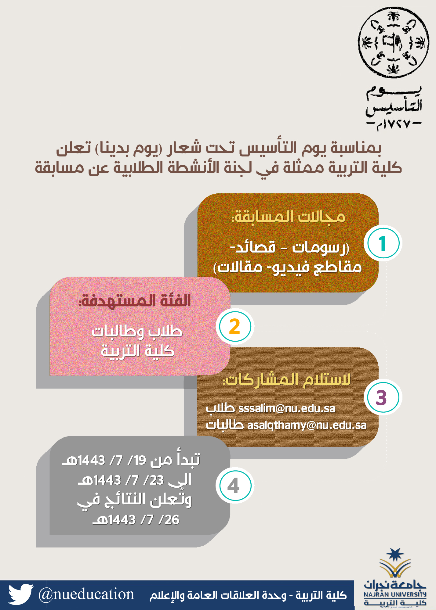 null بمناسبة يوم التأسيس تحت شعار (يوم بدينا) كلية التربية ممثلة في لجنة الأنشطة الطلابية عن مسابقة