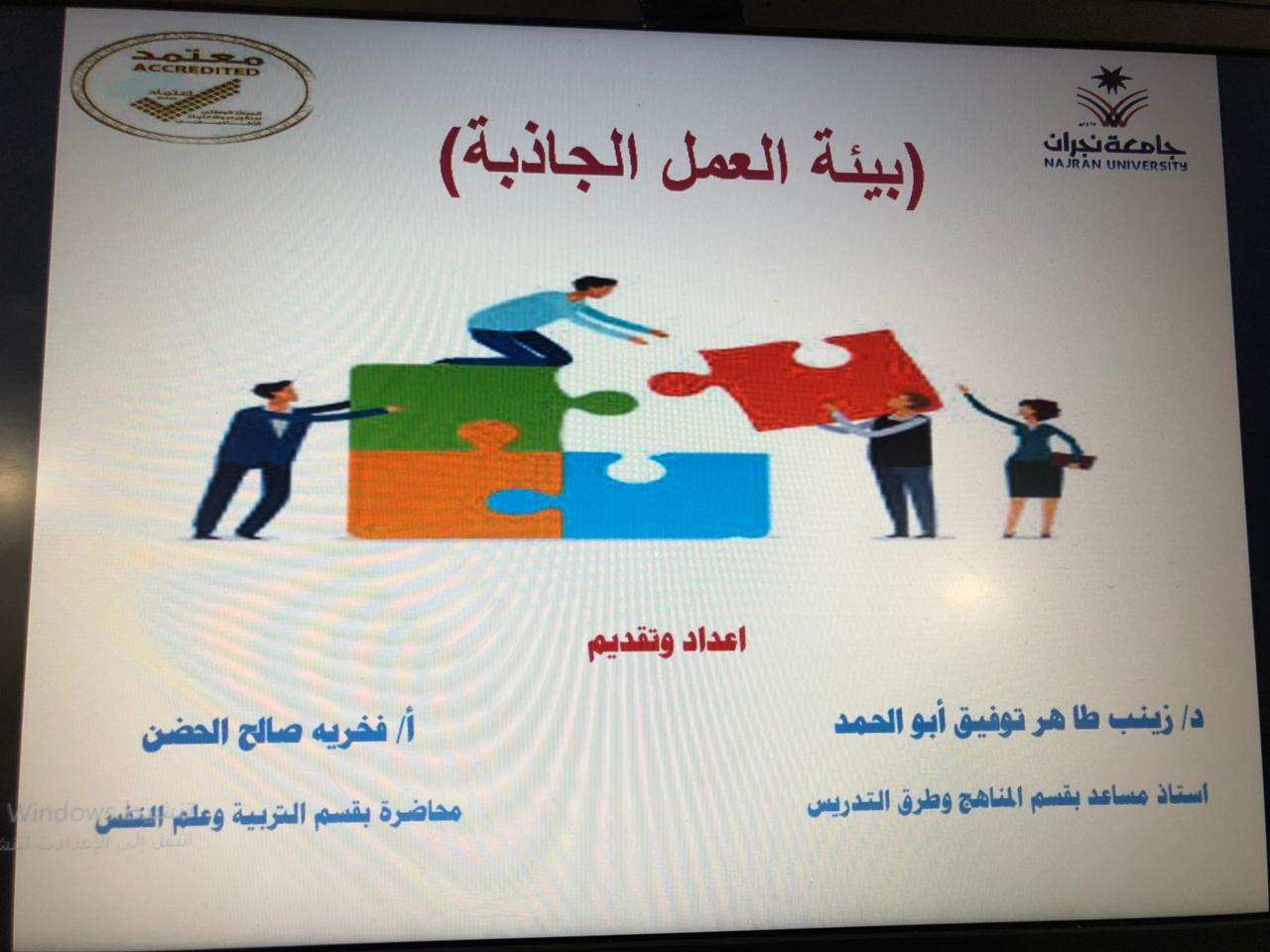 أقامت كلية التربية ممثلة في وحدة الخريجين يوم الخميس الموافق 8 /3/1443هـ دورة تدريبية بعنوان (بيئة العمل الجاذبة)، وقد استهدفت طالبات كلية التربية عبر منصة الفصول الافتراضية (البلاك بورد) ، وقد تناولت الدورة التي قدمتها د. زينب طاهر الأستاذ المساعد بقسم مناهج وطرق التدريس ، والأستاذة فخريه صالح الحضن محاضرة بقسم التربية وعلم النفس عدة محاور منها: بيئة العمل الجاذبة وإبعادها ، أفكار إبداعية في بيئة العمل الجاذبة ، القائد الناجح في بيئة العمل ، العادات العشر لنجاح الموظفين في بيئة العمل ،التحديات في بيئة العمل وطرق مواجهتها .