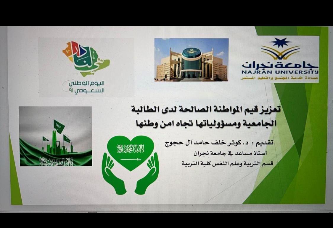 في ضوء الاحتفاء باليوم الوطني أقامت كلية التربية محاضرة بعنوان تعزيز قيم المواطنة الصالحة لدى الطالبة الجامعية ومسؤولياتها تجاه أمن وطنها ، استهدفت طالبات كلية التربية وعضوات هيئة التدريس كما تناولت المحاضرة التي قدمها: د. كوثر خلف حامد آل حجوج الاستاذ المساعد بكلية التربية عدة محاور منها:  مفاهيم المواطنة وقيمها ومقوماتها ،  مظاهر وسلوكيات الانتماء والولاء الوطني  ،مسؤولية  الطالبة الجامعية تجاه أمن وطنها في الازمات وخاصة ازمة كورونا بالإضافة الى مسؤولية الطالبة الجامعية تجاه الشائعات ، ومقومات تربية الأطفال على أسس المواطنة الصالحة