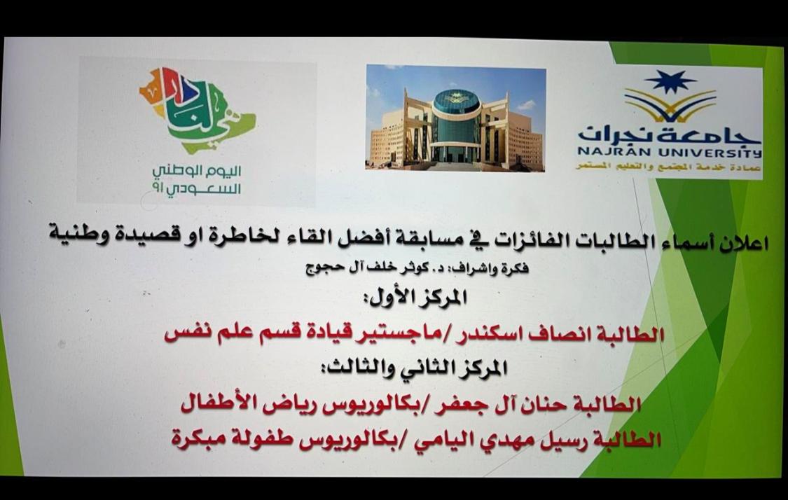 كما تم على هامش المحاضرة اعلان أسماء الطالبات الفائزات في مسابقة اليوم الوطني والتي كانت بعنوان "أفضل القاء لخاطرة او قصيدة وطنية" حيث فازت طالبة الماجستير في القيادة التربوية إنصاف إسكندر في المركز الأول عن القائها لقصيدة حب الوطن  فيما فازت الطالبة حنان آل جعفر والطالبة رسيل مهدي اليامي من قسم رياض الأطفال بالمركز الثاني والثالث على التوالي وذلك بناء على قرار  ومشاورات أعضاء لجنة التحكيم للمسابقة والتي ترأستها د.رحمة الغامدي وكيلة كلية التربية.