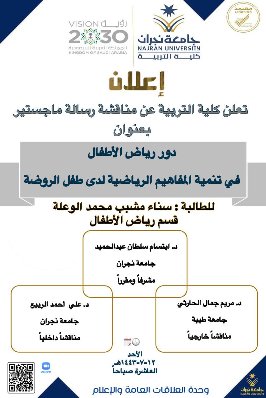 null تعلن كلية التربية عن مناقشة رسالة ماجستير بقسم رياض الأطفال