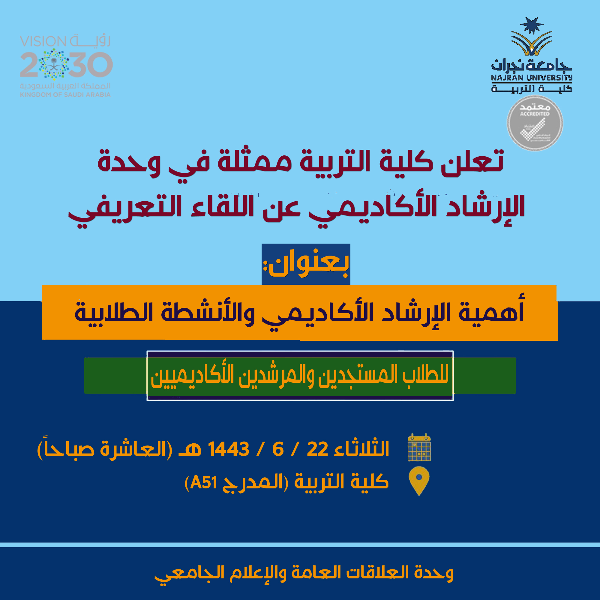 null تعلن كلية التربية ممثلة في وحدة الإرشاد الأكاديمي عن اللقاء التعريفي