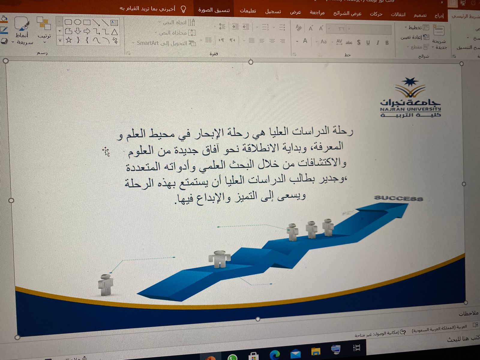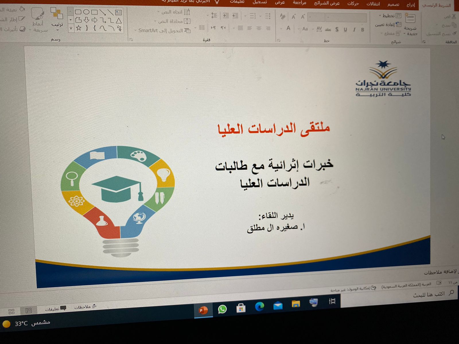 أقامت كلية التربية ممثلة في لجنة الدراسات العليا والبحث العلمي يوم الثلاثاء الموافق11 /4/1443هـ ضمن فعاليات ملتقى الدراسات العليا لقاء بعنوان (خبرات إثرائية مع طالبات الدراسات العليا)، وقد استهدفت طالبات الدراسات العليا بكلية التربية وذلك عبر الفصول الافتراضية بالبلاك بورد، وقد تناول اللقاء الذي قدمته طالبات الماجستير أميرة الوادعي(ماجستير رياض الأطفال) وصباح المصعبي (ماجستير المناهج وطرق التدريس) وعهود الضلعي (ماجستير التربية الخاصة) وأدارته أ.صغيرة ال مطلق المعيدة بقسم رياض الأطفال عدة محاور منها: كيفية إدارة الوقت في مرحلة الماجستير لإنجاز الرسالة العلمية ،الاستعداد للمناقشة العلمية،أهم محركات البحث التي يستعين بها طالبات الدراسات العليا ،نصائح لطالبات الدراسات العليا من واقع خبرتهم، أهم الصعوبات التي تواجه طالبات الدراسات العليا وكيفية التغلب عليها، عرض خبرات وتجارب ناجحة لبعض طالبات الدراسات العليا .
