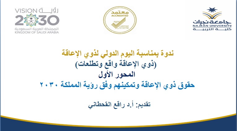 بمناسبة الاحتفاء باليوم الدولي لذوي الإعاقة، أقامت كلية التربية ممثلة في لجنة الأنشطة الطلابية بالتعاون مع قسم التربية الخاصة ندوة بعنوان (ذوي الإعاقة واقع وتطلعات استهدفت أعضاء هيئة التدريس وطلاب وطالبات الجامعة عبر منصة الفصول الافتراضية (البلاك بورد)