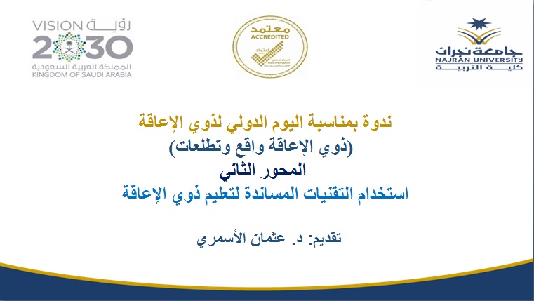 من جانبه قدم الأستاذ المساعد بقسم التربية الخاصة الدكتور عثمان الأسمري المحور الثاني للندوة حيث تناول استخدام التقنيات المساندة للأشخاص ذوي الإعاقة وأنواع التقنيات وفوائدها والواقع الحالي لتنفيذ التقنيات المساندة والقوانين والتشريعات المنظمة لذلك .