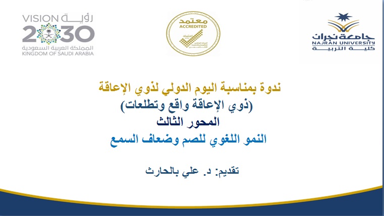 و بينما تمثل المحور الثالث للندوة بعنوان "النمو اللغوي للصم وضعاف السمع " قدمه الدكتور علي بالحارث الأستاذ المساعد بقسم التربية الخاصة ، متناولاً مراحل النمو اللغوي لدى الأطفال الصم وضعاف السمع ، و بعض المفاهيم الخاطئة للنمو اللغوي و مفهوم الصمم وعلاقته بالتحصيل الدراسي ، و التوجهات التربوية نحو تدريس الصم ، و دور التربويين و المجتمع تجاه الصم .
