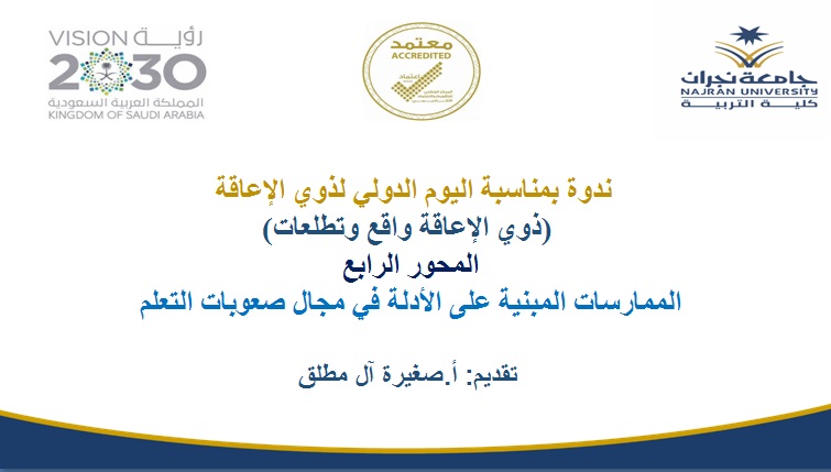 ومن جانبها تحدثت الأستاذة صغيرة آل مطلق المعيدة بقسم التربية الخاصة عن المحور الرابع للندوة والذي تناول" الممارسات المبنية على الأدلة في مجال صعوبات التعلم" .