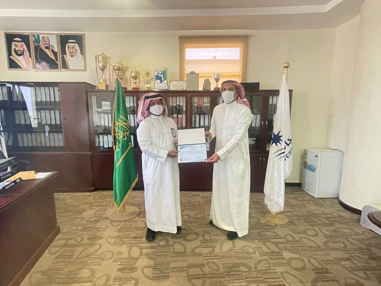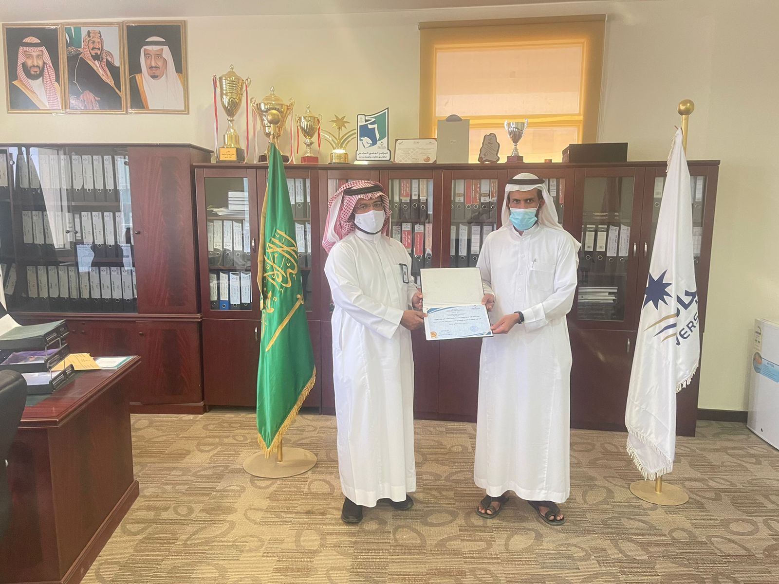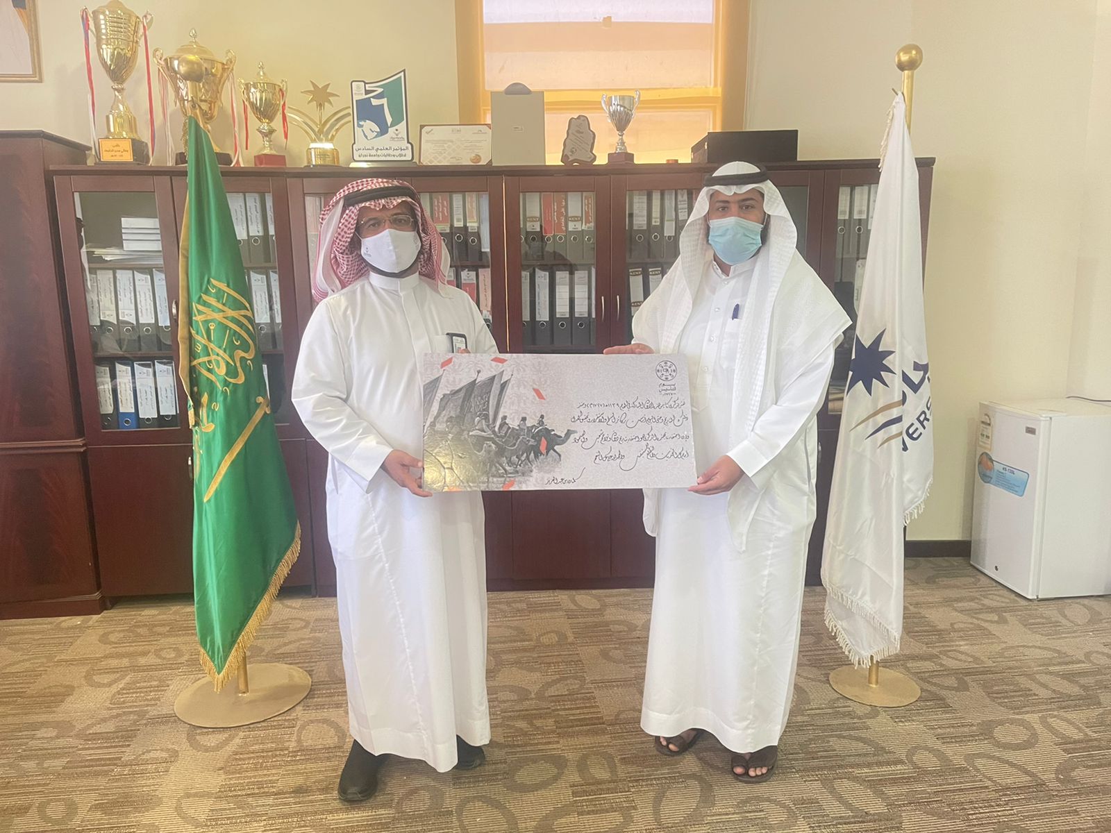 كرم عميد كلية التربية الأستاذ الدكتور : محمد بن عبد الله الحازمي طلاب الكلية الفائزين في المسابقة المتنوعة التي نظمتها لجنة الأنشطة الطلابية بالكلية ، تحت شعار " يوم بدينا" وذلك ضمن فعاليات كلية التربية للاحتفاء بيوم التأسيس، وقد اشتملت المسابقة على مجموعة من الأنشطة المتمثلة في القصائد الشعرية الوطنية ، والتصاميم التوعوية ،والفيديوهات والرسومات، وقد فاز في المسابقة كل من : الطالب محمد احمد آل شيبان من خلال مشاركته بفيديو توعوي عن يوم التأسيس بلغة الإشارة ، والطالب : علي محمد الهمامي بمشاركته بقصيدة شعرية وطنية ، والطالب : عمر سالم الغامدي بمشاركته بلوحة فنية عن يوم التأسيس