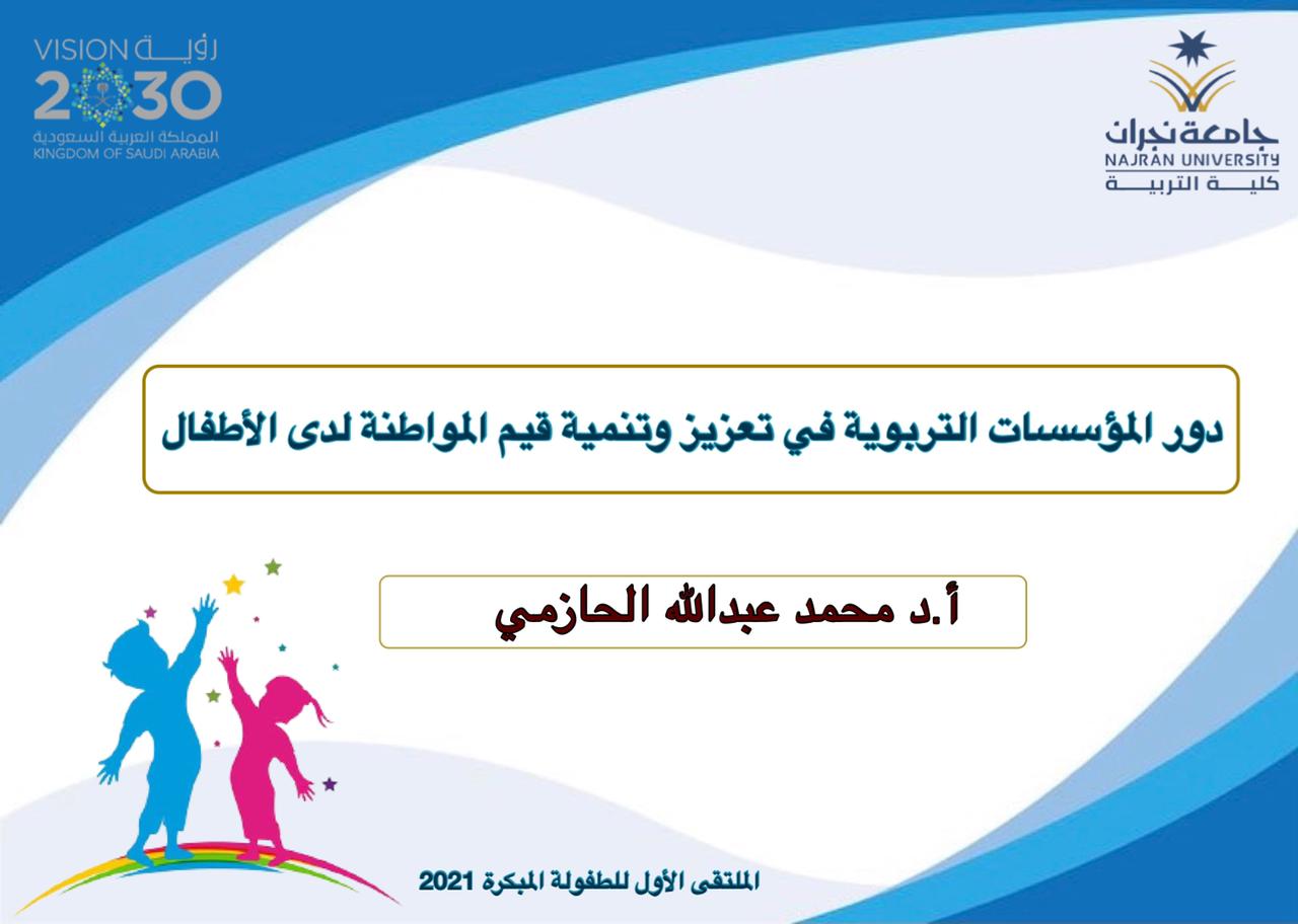 فيما ناقشت الجلسة الأخيرة أهمية تعزيز قيم المواطنة لدى الأطفال والتي قدمها سعادة عميد كلية التربية أ.د محمد الحازمي والتي جاءت بعنوان "دور المؤسسات التربوية في تعزيز وتنمية قيم المواطنة لدى الأطفال "