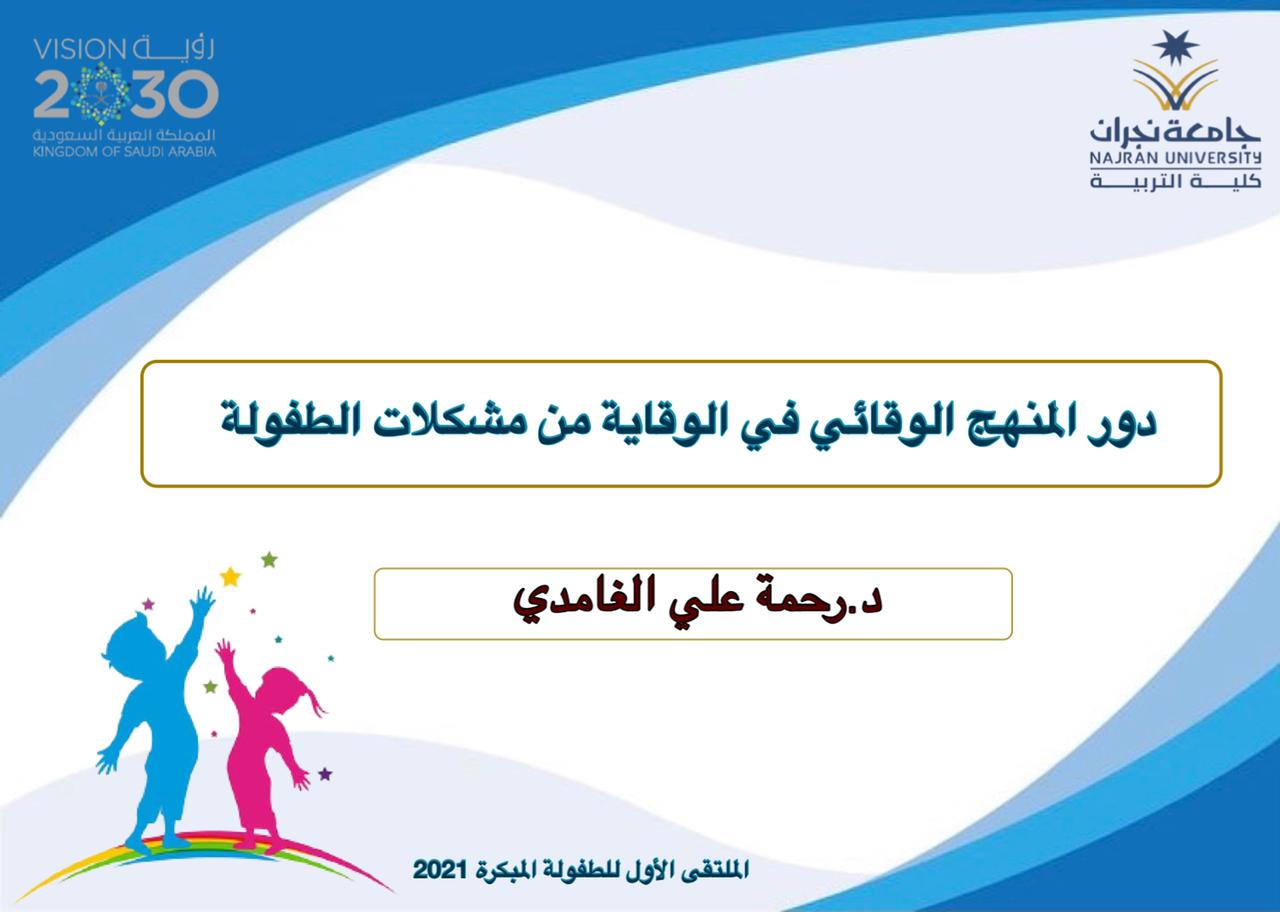 أقامت كلية التربية ممثلة في قسم رياض الأطفال بمناسبة اليوم العالمي للطفل  يوم الثلاثاء الموافق 18/4/1443هـ الملتقى الأول للطفولة المبكرة تحت شعار (قدرات أطفالنا. مستقبل وطننا)، وقد استهدف الملتقى أعضاء هيئة التدريس والطالبات والباحثين والباحثات في مجال الطفولة المبكرة ،والعاملين في ميادين الطفولة المبكرة من معلمات وقائدات ومشرفات وذلك عبر  منصةzoom ، حيث بدأ الملتقى بآيات من الذكر الحكيم جاء بعدها كلمة تستعرض تاريخ اليوم العالمي للطفل ،وجهود المملكة وحرص قيادتها الرشيدة بكل ما يخص الطفل وحقوقه . ثم بدأ الملتقى بالجلسة الأولى التي حملت عنوان "دور المنهج الوقائي في الوقاية من مشكلات الطفولة "والتي قدمتها وكيلة كلية التربية د.رحمة الغامدي أستاذ الإرشاد النفسي المشارك .