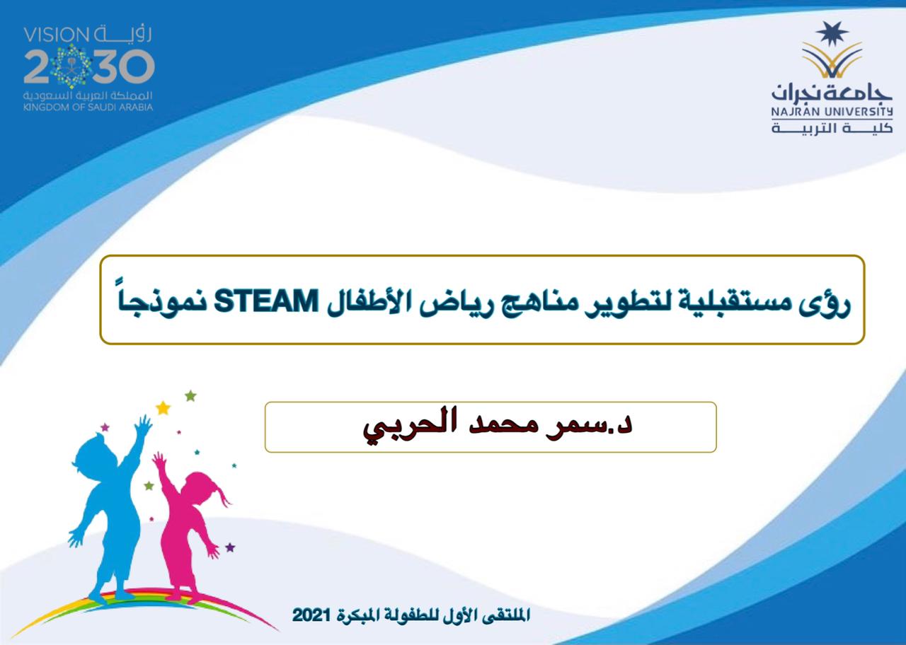 وناقشت الجلسة الثانية تطوير مناهج رياض الأطفال والتي حملت عنوان "رؤى مستقبلية لتطوير مناهج رياض الأطفال STEAM  نموذجاً " والتي قدمتها رئيسة قسم رياض الأطفال د.سمر الحربي أستاذ تقنيات التعليم المساعد .