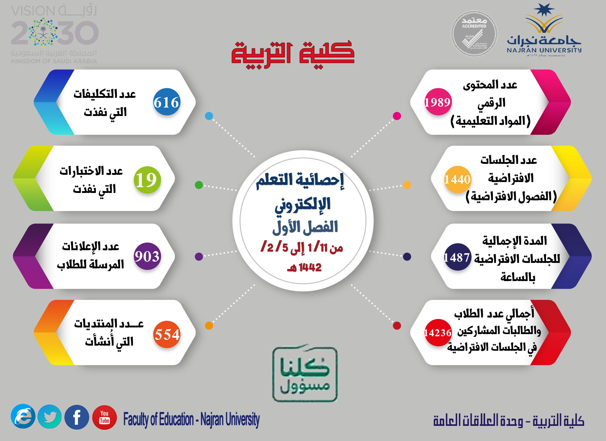 أصدرت كلية التربية التقرير الأول للتعلم الإلكتروني والتعليم عن بعد للشهر الأول من الفصل الدراسي الأول1441/142هـ  في الفترة ما بين (11/1/1442هـ- 5/2/1442ه) ،حيث تضمن إحصائيات متنوعة تؤكد نجاح الأنظمة والإجراءات المتخذة في عملية التعلم الالكتروني  والتعليم عن بُعد. وأظهر التقرير تنفيذ عددٍ من المحتويات الرقمية بلغ عددها (1989) محتوى رقمياً، و(1440) جلسة افتراضية ،و بلغت المدة الإجمالية للجلسات الافتراضية التي نفذتها الكلية (1487) ساعة ، و(616) تكليفاً إلكترونياً ، و(19) اختباراً إلكترونياً ، و (903) إعلاناً ، بالإضافة إلى (554) منتدى إلكترونيًا ، كما بلغ العدد الإجمالي للطلاب والطالبات المشاركين في الجلسات الافتراضية (14236) طالباً وطالبة.