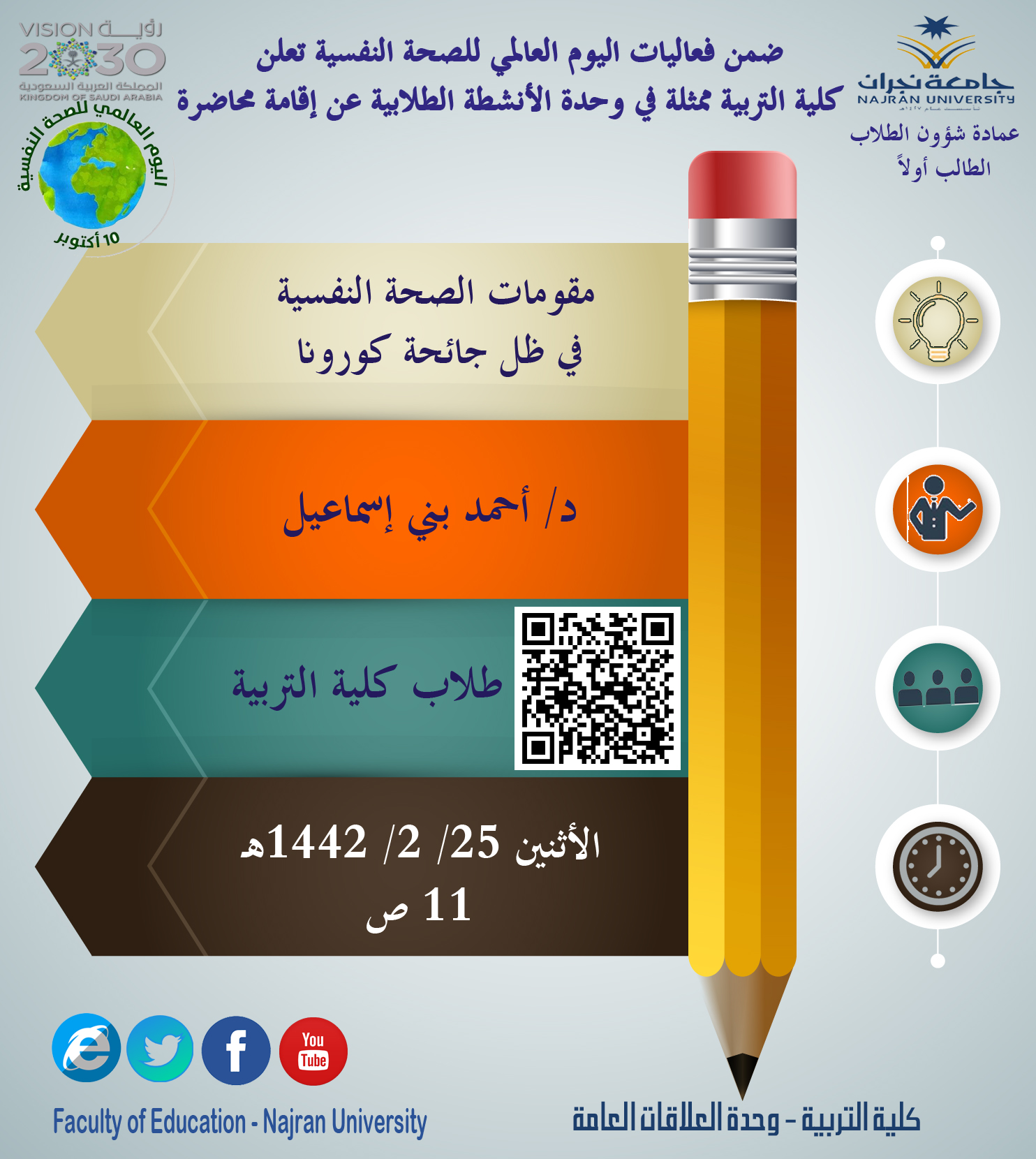 ضمن فعاليات اليوم العالمي للصحة النفسية أقامت كلية التربية ممثلة في وحدة الأنشطة الطلابية يوم الاثنين الموافق 25/2/1442هـ محاضرة بعنوان (مقومات الصحة النفسية في ظل جائحة كورونا) ،وقد استهدفت طلاب كلية التربية ( عبر الفصول الافتراضية، البلاك بورد) ، وقد تناولت المحاضرة التي قدمها د. احمد بني إسماعيل الأستاذ المساعد بقسم التربية وعلم النفس عدة محاور منها: مؤشـــــــرات الصــحة النـــــفسية ومظاهرها ، مقومات الصحة النفسية في ظل جائحة كورونا. وعلاقة الجانب الإدراكي المعرفي للشخصية بالصحة النفسية .