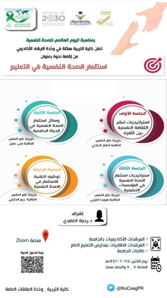وفي سياق أخر أقامت كلية التربية شطر الطالبات ممثلة في وحدة الإرشاد الأكاديمي ندوة بعنوان (استثمار الصحة النفسية في التعليم)، وقد استهدفت المرشدات الأكاديميات بالجامعة والمرشدات الطلابيات بمدارس التعليم العام وطالبات الجامعة وذلك عبر منصة Zoom، وقد تناولت الندوة التي قدمها خريجات برنامج بكالوريوس علم النفس بإشراف وكيلة كلية التربية د. رحمة الغامدي عدة محاور منها : وسائل نشر ثقافة الصحة النفسية ، وسائل استثمار الصحة النفسية في الحياة الاجتماعية، استراتيجيات استثمار الصحة النفسية في المؤسسات التعليمية، توظيف التقنية في الصحة النفسية.