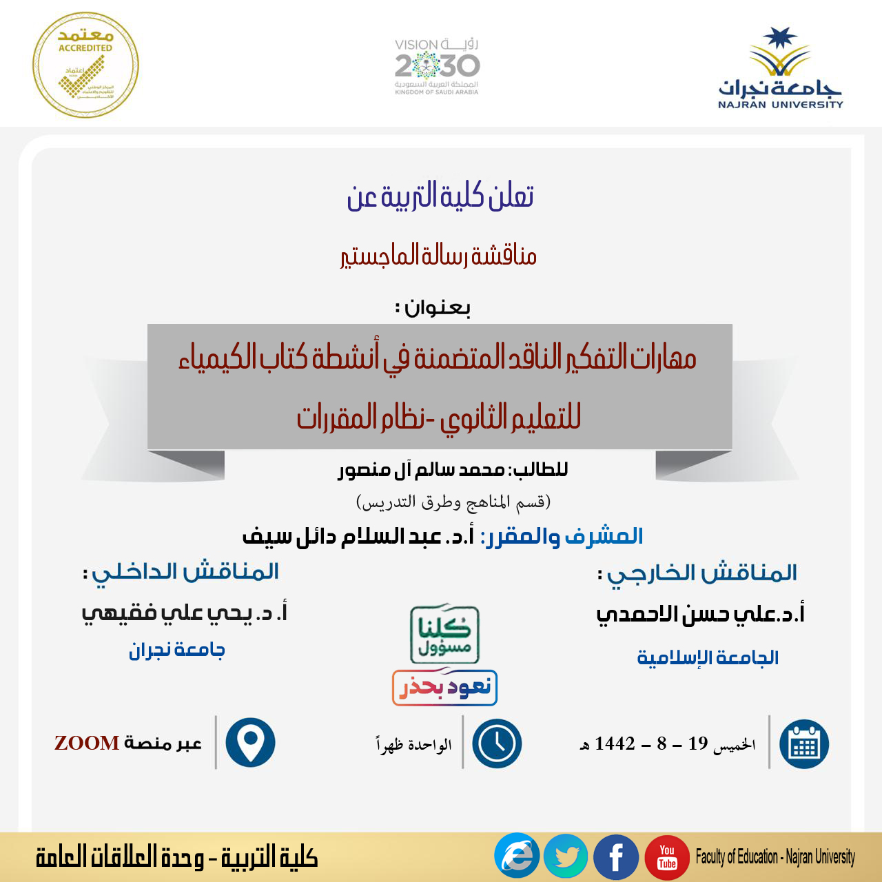 ناقش قسم المناهج وطرق التدريس بكلية التربية يوم الخميس 29/8/1442هـ رسالة الماجستير الموسومة بـ: مهارات التفكير الناقد المتضمنة في أنشطة كتاب الكيمياء للتعليم الثانوي -نظام المقررات  والمقدمة من الطالب: محمد سالم آل منصور، وقد تكونت لجنة المناقشة من الأستاذ الدكتور عبد السلام دائل سيف الأستاذ بقسم المناهج وطرق التدريس بجامعة نجران، مشرفاَ ومقرراً، والأستاذ الدكتور علي حسن الاحمدي الأستاذ بقسم المناهج وطرق التدريس بالجامعة الإسلامية بالمدينة المنورة، مناقشاً خارجياً ، والأستاذ الدكتور يحي علي فقيهي الأستاذ بقسم المناهج وطرق التدريس بجامعة نجران مناقشاً داخلياً ، وقد اجتاز الطالب المناقشة بنجاح ، وتتمنى له كلية التربية التوفيق والسداد .