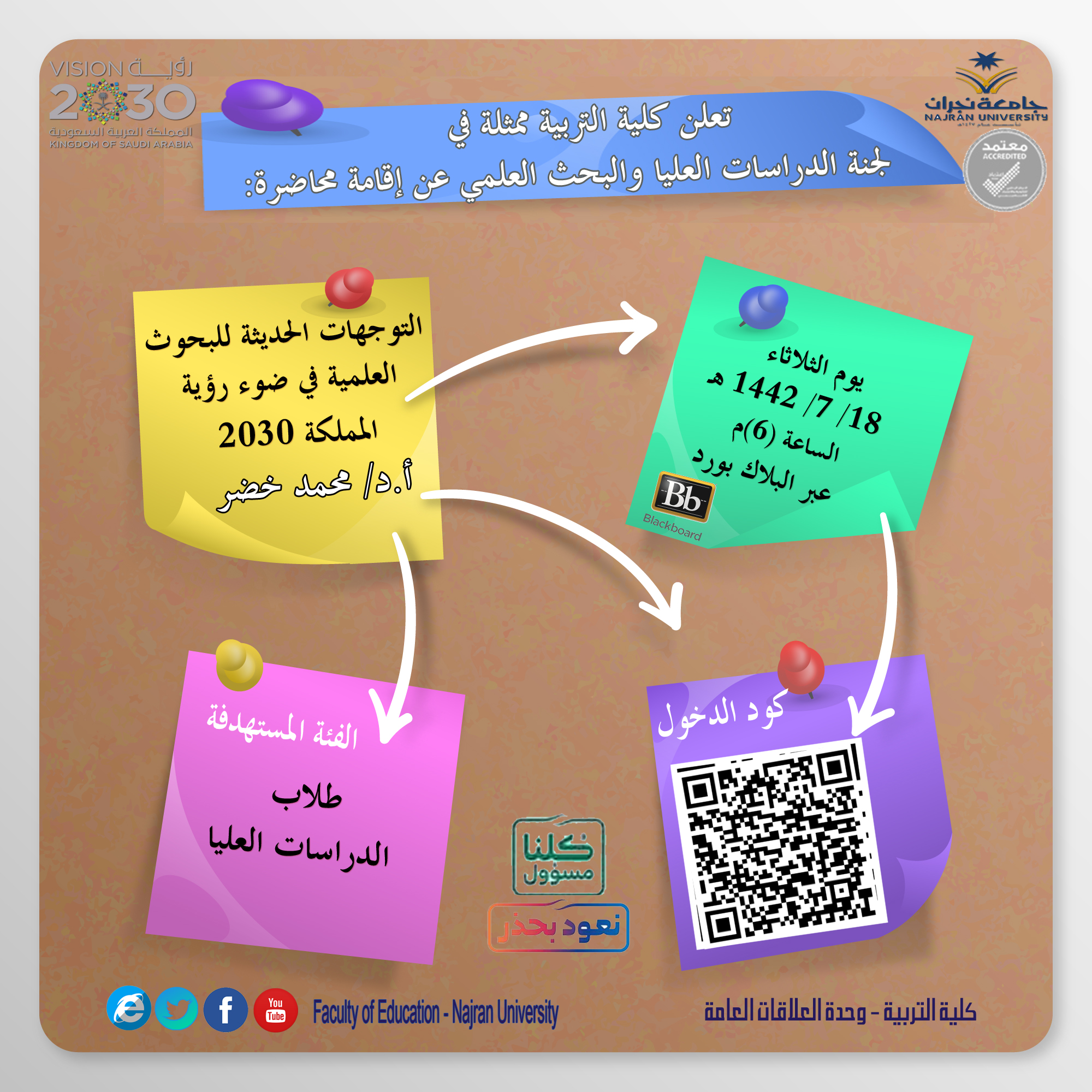 أقامت كلية التربية  ممثلة في لجنة الدراسات العليا والبحث العلمي يوم الثلاثاء الموافق 18/7/1442هـ محاضرة بعنوان (التوجهات الحديثة للبحوث العلمية في ضوء رؤية المملكة 2030 )، وقد استهدفت طلاب الدراسات العليا كلية التربية ( عبر الفصول الافتراضية، البلاك بورد) ، وقد تناولت المحاضرة التي قدمها أ.د. محمد خضر عبد المختار الأستاذ بقسم التربية وعلم النفس  بكلية التربية  عدة محاور منها: علاقة التوجهات البحثية برؤية المملكة 2030 ، خارطة التوجهات البحثية في التخصصات النظرية والتطبيقية في ضوء رؤية المملكة 2030 ، علاقة البحث العلمي بالاحتياجات الشاملة ، تحديات البحث العلمي في ظل الثورة المعرفية والتكنولوجية