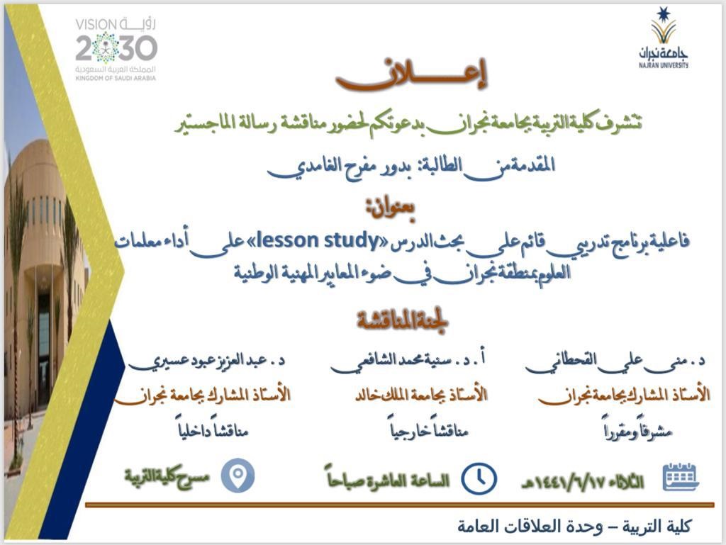 null يعلن قسم المناهج وطرق التدريس بكلية التربية عن مناقشة رسالة ماجستير